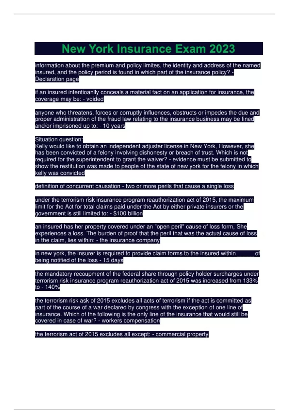 information about the premium and policy limites, the identity and address of the named insured, and the policy period is found in which part of the insurance policy? - Declaration page if an insured intentioanlly conceals a material fact on an application for insurance, the coverage may be: - voided anyone who threatens, forces or corruptly influences, obstructs or impedes the due and proper administration of the fraud law relating to the insurance business may be fined and/or imprisoned up to: - 10 years Situation question: Kelly would like to obtain an independent adjuster license in New York, However, she has been convicted of a felony involving dishonesty or breach of trust. Which is not required for the superintendent to grant the waiver? - evidence must be submitted to show the restitution was made to people of the state of new york for the felony in which kelly was convicted definition of concurrent causation - two or more perils that cause a single loss under the terrorism risk insurance program reauthorization act of 2015, the maximum limit for the Act for total claims paid under the Act by either private insurers or the government is still limited to: - $100 billion an insured has her property covered under an "open peril" cause of loss form, She experiences a loss. The burden of proof that the peril that was the actual cause of loss in the claim, lies within: - the insurance company in new york, the insurer is required to provide claim forms to the insured within _____ of being notified of the loss - 15 days the mandatory recoupment of the federal share through policy holder surcharges under terrorism risk insurance program reauthorization act of 2015 was increased from 133% to - 140% the terrorism risk ask of 2015 excludes all acts of terrorism if the act is committed as part of the course of a war declared by congress with the exception of one line of insurance. Which of the following is the only line of the insurance that would still be covered in case of war? - workers compensation the terrorism act of 2015 excludes all except: - commercial property all of the following are claim practice principles (ethical principles) to be followed by all insurers in New York, except: - the new york adjuster should demand verification of facts, even if the facts presented by the claimant are reasonably clear, just to be sure the insurer does not pay a claim for which they are not responsible. describe a representation in an insurance application - a statement made by the applicant that he believes to be true when made, but which might prove to be false what is NOT true concerning the large number law? - the size of the sample group is not relevant to the accuracy of the results the doctrine that states an insured's policy should provide the coverage that a sensible and prudent person would expect is: - the reasonable expectation doctrine describe the concept of risk - uncertainty of loss Situational question: Mikala is walking to her car and suddenly a guy comes up and is holding a gun to her head demanding her purse or he will kill her. Mikala just experienced: - robbery the adjuster bond required in New York is payable to - the state of new york when can the new york superintendent of insurance revoke an adjuster's license? - not until a hearing is held what is generally not considered to be legal defense against claims of negligence? - loss to the plaintiff was caused intentionally by the defendant under the new york cybersecurity regulation, an exempt covered entity that ceases to qualify for an exemption will have _____ to comply with the requirements of the regulations. - 180 days under the new york cybersecurity regulation each covered entity, including insurance companies, must submit a written statement by ______ of each year certifuing that it is in compliance: - february 15 What is not a characteristic of an aleatory contract? - contract allows the insured to receive a return on claims payments that is nearly equal to the amount paid in premium Situational example: Steve and his insurance cannot agree on the amount of property damage. Both parties selected an appraiser but can't agree on the amount the appraisers attempt to select the umpire but can't agree. What happens next? - steve and the insurance company can request that the umpire be selected by the court of law For a liability policy to pay a claim, the person who is legally liable: - must be an "insured" under the policy the process by which an insurance company selects certain types of risk that have historically producaed a loss is known as: - underwriting elements of a valid contract: - C.L.O.C Competent parties Legal Offer and acceptance Consideration insurance contracts are contingent upon certain events that provide for the unequal transfer of value between the parties is a __________ contract - aleatory written modification of an insurance policy - endorsement type of insurer that may conduct business in a state with out holding a certification of authority? - surplus lines company doctrine stating if loss or damage to property occurs as a result of two or more causes, one is covered and other is not: - concurrent causation type of loss when the covered property is destroyed beyond repair and nothing of value remains - actual total loss a method of calculating actual cash value using a combination of the fair market value and the cost of replacement minus depreciation - Brood evidence rule loss valuation method that pays the value scheduled on the policy, or actual cash value - Stated Value type of liability that may be imposed on an insured who is participating in a certain activity that is particularly hazardous - absolute liability common law defense against neglicense that states "if an individual contributes to his or her own loss in any way, then another person cannot be held liable for the loss", is known as: - contributory negligence liability policy limit that only pays one amount with respect to any