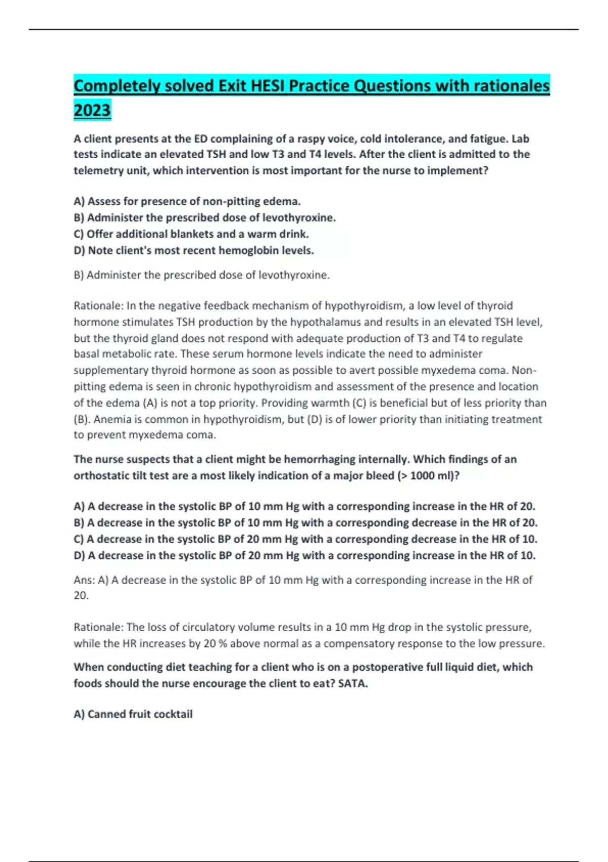 Completely solved Exit HESI Practice Questions with rationales 2023.
