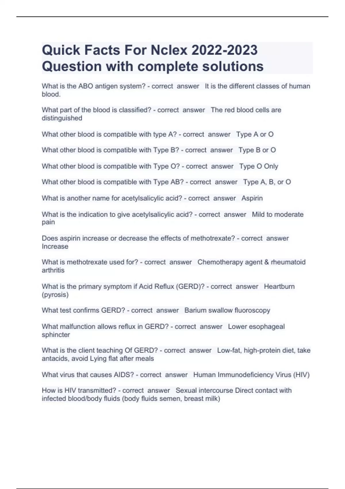 Quick Facts For Nclex Question with complete solutions What is the ABO antigen system? - correct answer It is the different classes of human blood. What part of the blood is classified? - correct answer The red blood cells are distinguished What other blood is compatible with type A? - correct answer Type A or O What other blood is compatible with Type B? - correct answer Type B or O What other blood is compatible with Type O? - correct answer Type O Only What other blood is compatible with Type AB? - correct answer Type A, B, or O What is another name for acetylsalicylic acid? - correct answer Aspirin What is the indication to give acetylsalicylic acid? - correct answer Mild to moderate pain Does aspirin increase or decrease the effects of methotrexate? - correct answer Increase What is methotrexate used for? - correct answer Chemotherapy agent & rheumatoid arthritis What is the primary symptom if Acid Reflux (GERD)? - correct answer Heartburn (pyrosis) What test confirms GERD? - correct answer Barium swallow fluoroscopy What malfunction allows reflux in GERD? - correct answer Lower esophageal sphincter What is the client teaching Of GERD? - correct answer Low-fat, high-protein diet, take antacids, avoid Lying flat after meals What virus that causes AIDS? - correct answer Human Immunodeficiency Virus (HIV) How is HIV transmitted? - correct answer Sexual intercourse Direct contact with infected blood/body fluids (body fluids semen, breast milk)