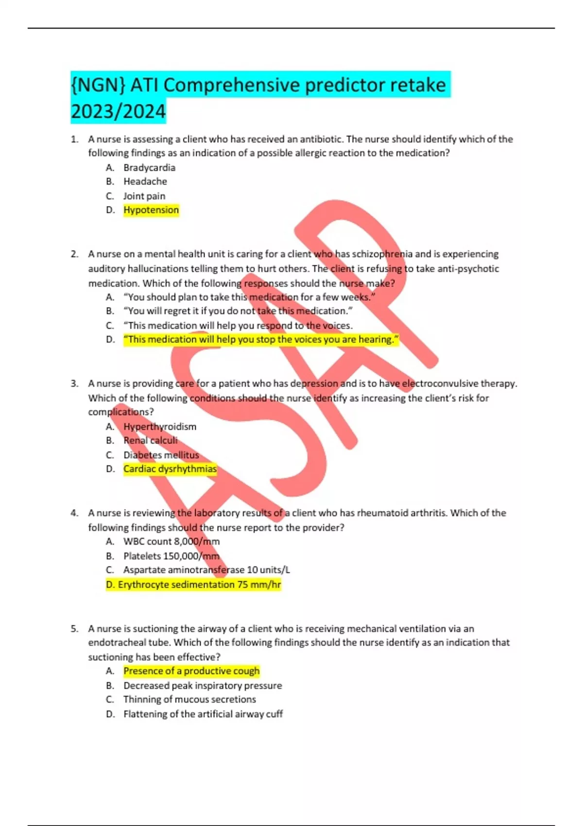 {NGN} ATI Comprehensive predictor retake 2023/2024 1. A nurse is assessing a client who has received an antibiotic. The nurse should identify which of the following findings as an indication of a possible allergic reaction to the medication? A. Bradycardia B. Headache C. Joint pain D. Hypotension 2. A nurse on a mental health unit is caring for a client who has schizophrenia and is experiencing auditory hallucinations telling them to hurt others. The client is refusing to take anti-psychotic medication. Which of the following responses should the nurse make? A. “You should plan to take this medication for a few weeks.” B. “You will regret it if you do not take this medication.” C. “This medication will help you respond to the voices. D. “This medication will help you stop the voices you are hearing.” 3. A nurse is providing care for a patient who has depression and is to have electroconvulsive therapy. Which of the following conditions should the nurse identify as increasing the client’s risk for complications? A. Hyperthyroidism B. Renal calculi C. Diabetes mellitus D. Cardiac dysrhythmias 4. A nurse is reviewing the laboratory results of a client who has rheumatoid arthritis. Which of the following findings should the nurse report to the provider? A. WBC count 8,000/mm B. Platelets 150,000/mm C. Aspartate aminotransferase 10 units/L D. Erythrocyte sedimentation 75 mm/hr 5. A nurse is suctioning the airway of a client who is receiving mechanical ventilation via an endotracheal tube. Which of the following findings should the nurse identify as an indication that suctioning has been effective? A. Presence of a productive cough B. Decreased peak inspiratory pressure C. Thinning of mucous secretions D. Flattening of the artificial airway cuff 6. A nurse is caring for a client who is in a seclusion room following violent behavior. The client continues to display aggressive behavior. Which of the following actions should the nurse take? A. Stand within 30cm (1 ft) of the client when speaking with them. B. Express sympathy for the client’s situation. C. Confront the client about his behavior. D. Speak assertively to the client. 7. A nurse is caring for a client who is immediately postoperative following an adrenalectomy to treat Cushing’s disease. Which of the following actions is the nurse’s priority? A. Reposition the client for comfort every 2 hours B. Observe for any indications of infection C. Document amount and color of the incisional drainage. D. Monitor the client’s fluid and electrolyte status. 8. A nurse is caring for a client who is scheduled for a surgical procedure and states, “I don’t want to have this surgery anymore.” Which of the following responses should the nurse make? A. “We can manage your care following the procedure without complications.” B. “You have the right to refuse the procedure.” C. “Your doctor thinks the surgery is necessary.” D. “Let me review the procedure so you can understand what is going to happen.” 9. A nurse is evaluating a client who has borderline personality disorder. Which of the following behaviors indicates an improvement in the client’s condition? A. Impulsive behaviors B. Decreased clinging behavior C. Liability of mood D. Dependent behavior 10. A nurse is teaching a group of school-age children about healthy snack options. Which of the following snacks should the nurse include? A. Air-popped popcorn B. Milkshake made with whole milk. C. Baked potato chips D. Cheesecake 11. A nurse is providing teaching to a client who has a new prescription for enoxaparin. Which of the following medications for pain relief should the nurse include in the teaching that can be taken concurrently with enoxaparin? A. Naproxen sodium B. Ibuprofen