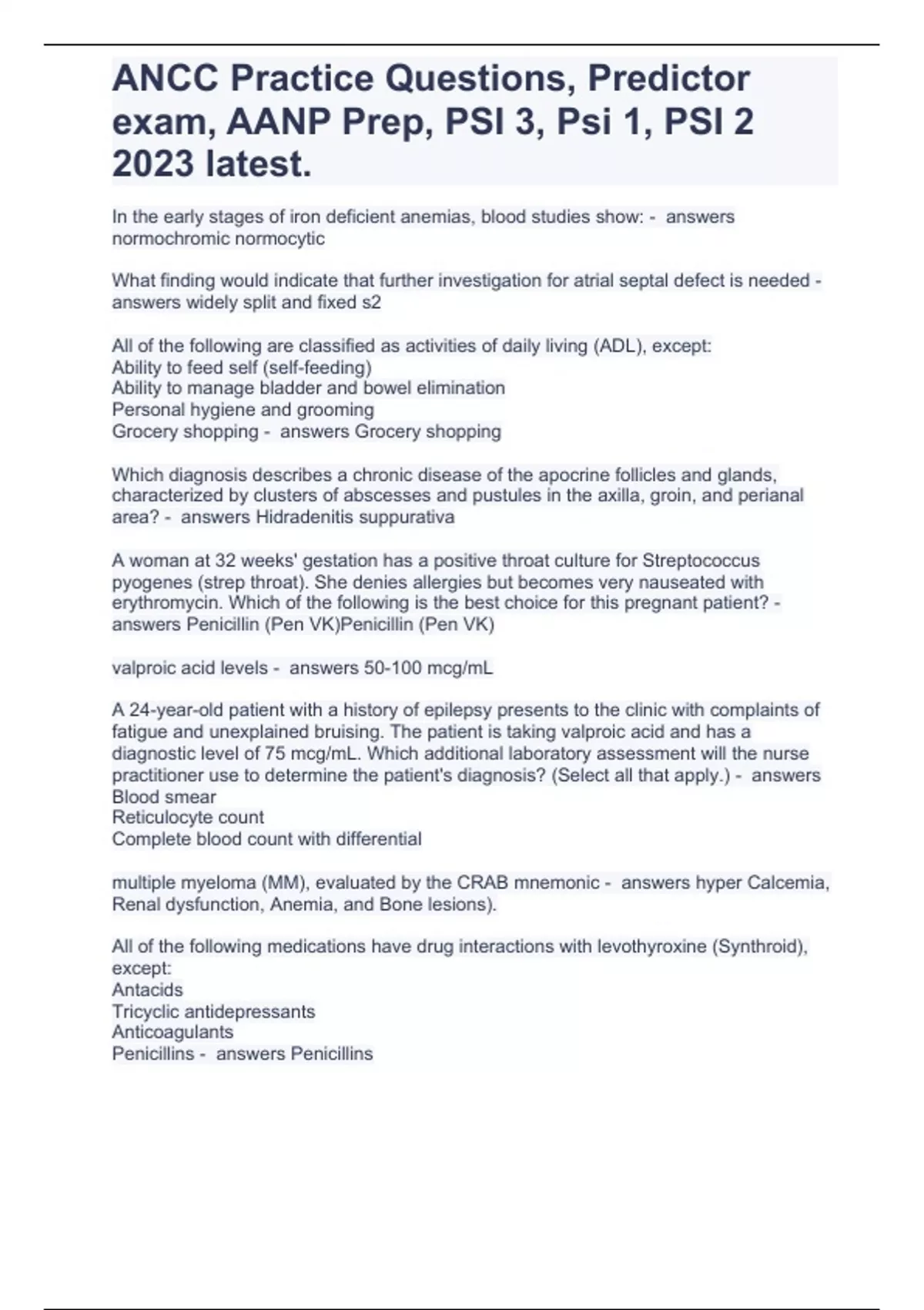 ANCC Practice Questions, Predictor exam, AANP Prep, PSI 3, Psi 1, PSI 2 2023 latest.