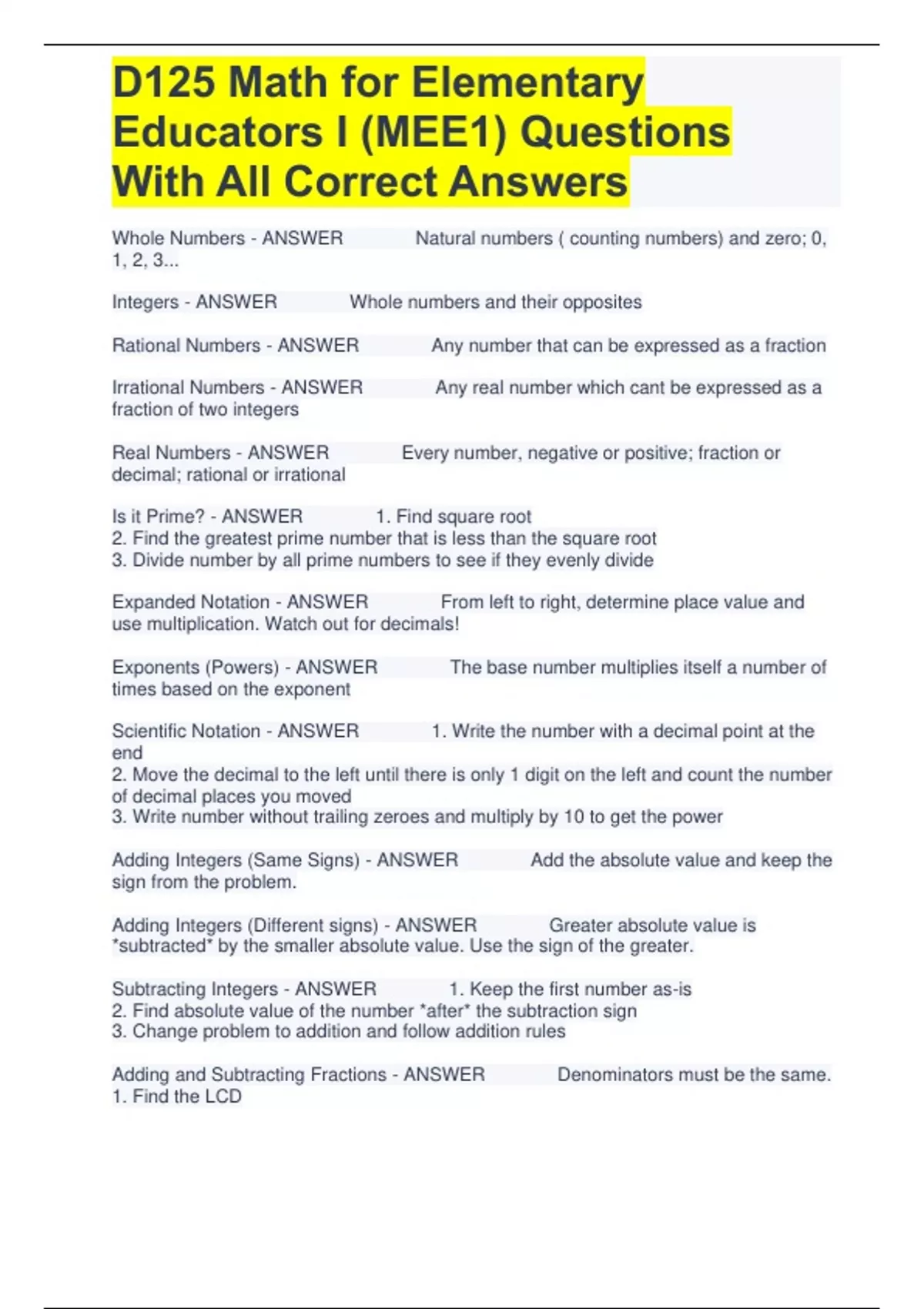 D125 Math for Elementary Educators I (MEE1) Questions With All Correct Answers Whole Numbers - ANSWER Natural numbers ( counting numbers) and zero; 0, 1, 2, 3... Integers - ANSWER Whole numbers and their opposites Rational Numbers - ANSWER Any number that can be expressed as a fraction Irrational Numbers - ANSWER Any real number which cant be expressed as a fraction of two integers Real Numbers - ANSWER Every number, negative or positive; fraction or decimal; rational or irrational Is it Prime? - ANSWER 1. Find square root 2. Find the greatest prime number that is less than the square root 3. Divide number by all prime numbers to see if they evenly divide Expanded Notation - ANSWER From left to right, determine place value and use multiplication. Watch out for decimals! Exponents (Powers) - ANSWER The base number multiplies itself a number of times based on the exponent Scientific Notation - ANSWER 1. Write the number with a decimal point at the end 2. Move the decimal to the left until there is only 1 digit on the left and count the number of decimal places you moved 3. Write number without trailing zeroes and multiply by 10 to get the power