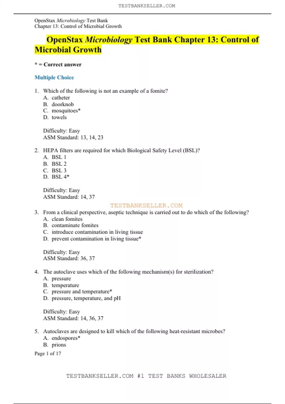 OpenStax Microbiology Test Bank Chapter 13: Control of Microbial Growth * = Correct answer Multiple Choice 1. Which of the following is not an example of a fomite? A. catheter B. doorknob C. mosquitoes* D. towels Difficulty: Easy ASM Standard: 13, 14, 23 2. HEPA filters are required for which Biological Safety Level (BSL)? A. BSL 1 B. BSL 2 C. BSL 3 D. BSL 4* Difficulty: Easy ASM Standard: 14, 37TESTBANKSELLER.COM 3. From a clinical perspective, aseptic technique is carried out to do which of the following? A. clean fomites B. contaminate fomites C. introduce contamination in living tissue D. prevent contamination in living tissue* Difficulty: Easy ASM Standard: 36, 37 4. The autoclave uses which of the following mechanism(s) for sterilization? A. pressure B. temperature C. pressure and temperature* D. pressure, temperature, and pH Difficulty: Easy ASM Standard: 14, 36, 37 5. Autoclaves are designed to kill which of the following heat-resistant microbes? A. endospores* B. prions TESTBANKSELLER.COM
