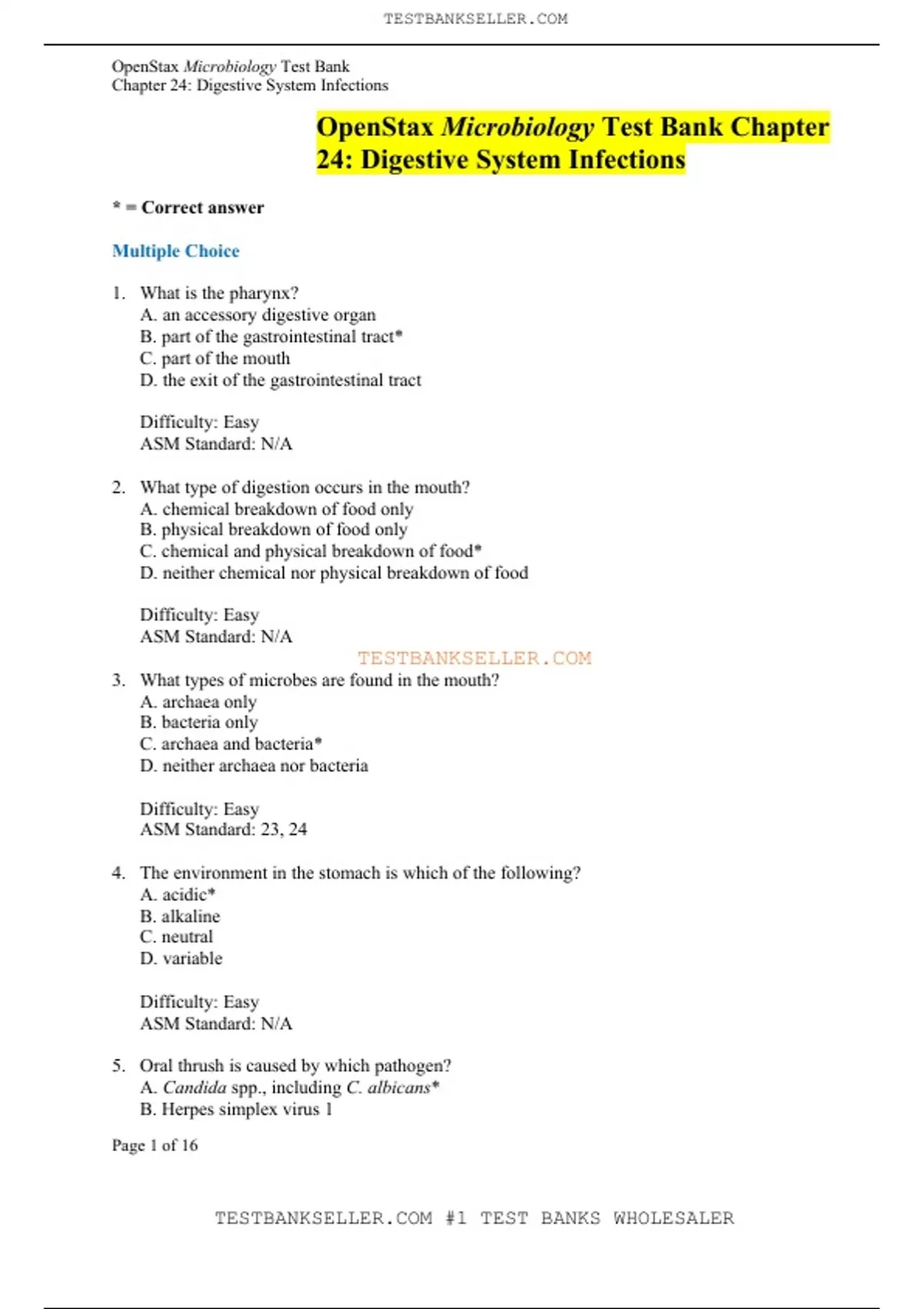 OpenStax Microbiology Test Bank Chapter 24: Digestive System Infections * = Correct answer Multiple Choice 1. What is the pharynx? A. an accessory digestive organ B. part of the gastrointestinal tract* C. part of the mouth D. the exit of the gastrointestinal tract Difficulty: Easy ASM Standard: N/A 2. What type of digestion occurs in the mouth? A. chemical breakdown of food only B. physical breakdown of food only C. chemical and physical breakdown of food* D. neither chemical nor physical breakdown of food Difficulty: Easy ASM Standard: N/A TESTBANKSELLER.COM 3. What types of microbes are found in the mouth? A. archaea only B. bacteria only C. archaea and bacteria* D. neither archaea nor bacteria Difficulty: Easy ASM Standard: 23, 24 4. The environment in the stomach is which of the following? A. acidic* B. alkaline C. neutral D. variable Difficulty: Easy ASM Standard: N/A