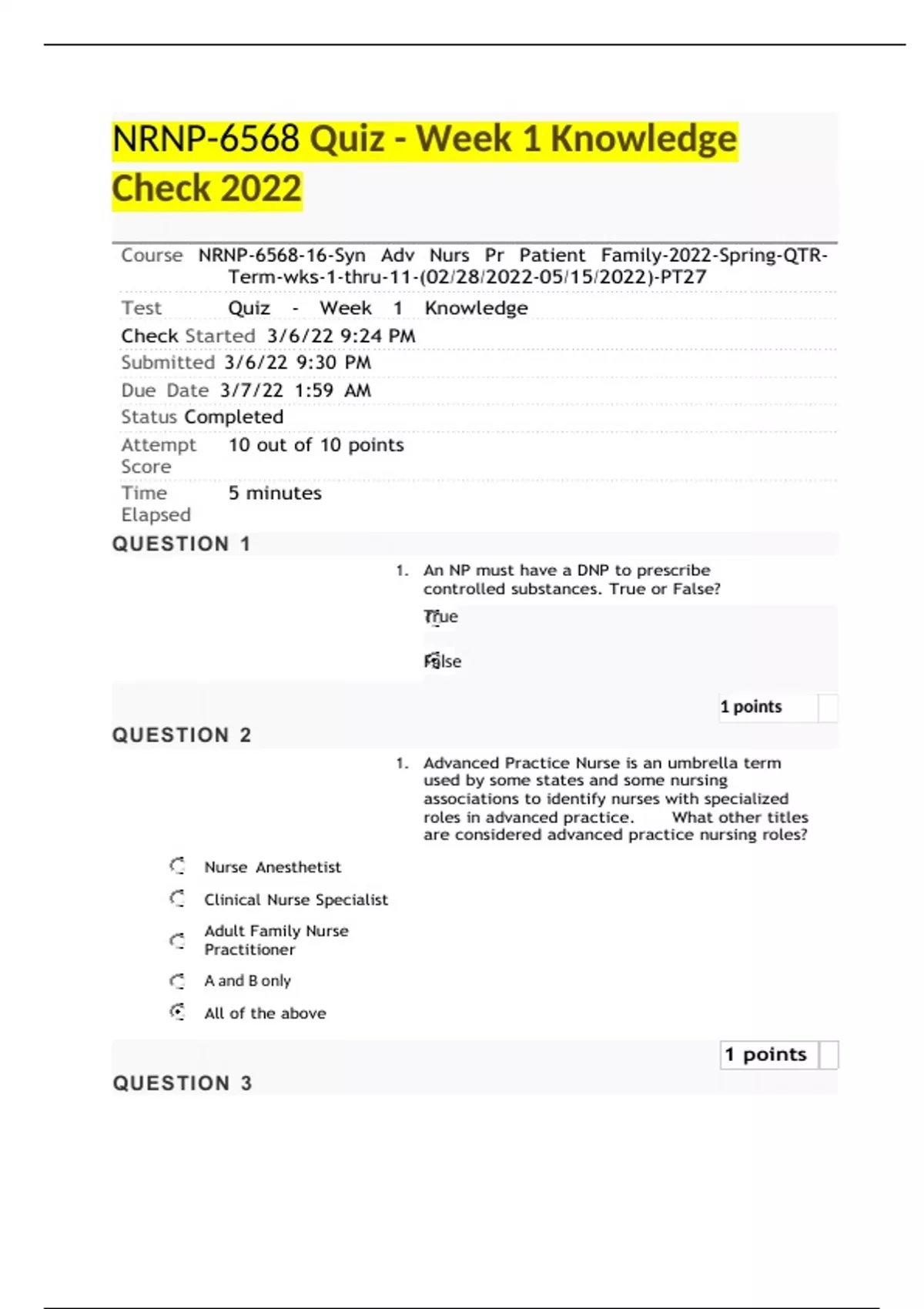 NRNP-6568 Quiz - Week 1 Knowledge Check 2022 Course NRNP-6568-16-Syn Adv Nurs Pr Patient Family-2022-Spring-QTR- Term-wks-1- thru-11-(02/28/2022-05/15/2022)-PT27 Test Quiz - Week 1 Knowledge Check Started 3/6/22 9:24 PM Submitted 3/6/22 9:30 PM Due Date 3/7/22 1:59 AM Status Completed Attempt Score Time Elapsed 10 out of 10 points 5 minutes QUESTION 1 1. An NP must have a DNP to prescribe controlled substances. True or False? 1 points QUESTION 2 Nurse Anesthetist Clinical Nurse Specialist Adult Family Nurse Practitioner A and B only All of the above 1. Advanced Practice Nurse is an umbrella term used by some states and some nursing associations to identify nurses with specialized roles in advanced practice. What other titles are considered advanced practice nursing roles? 1 points QUESTION 3
