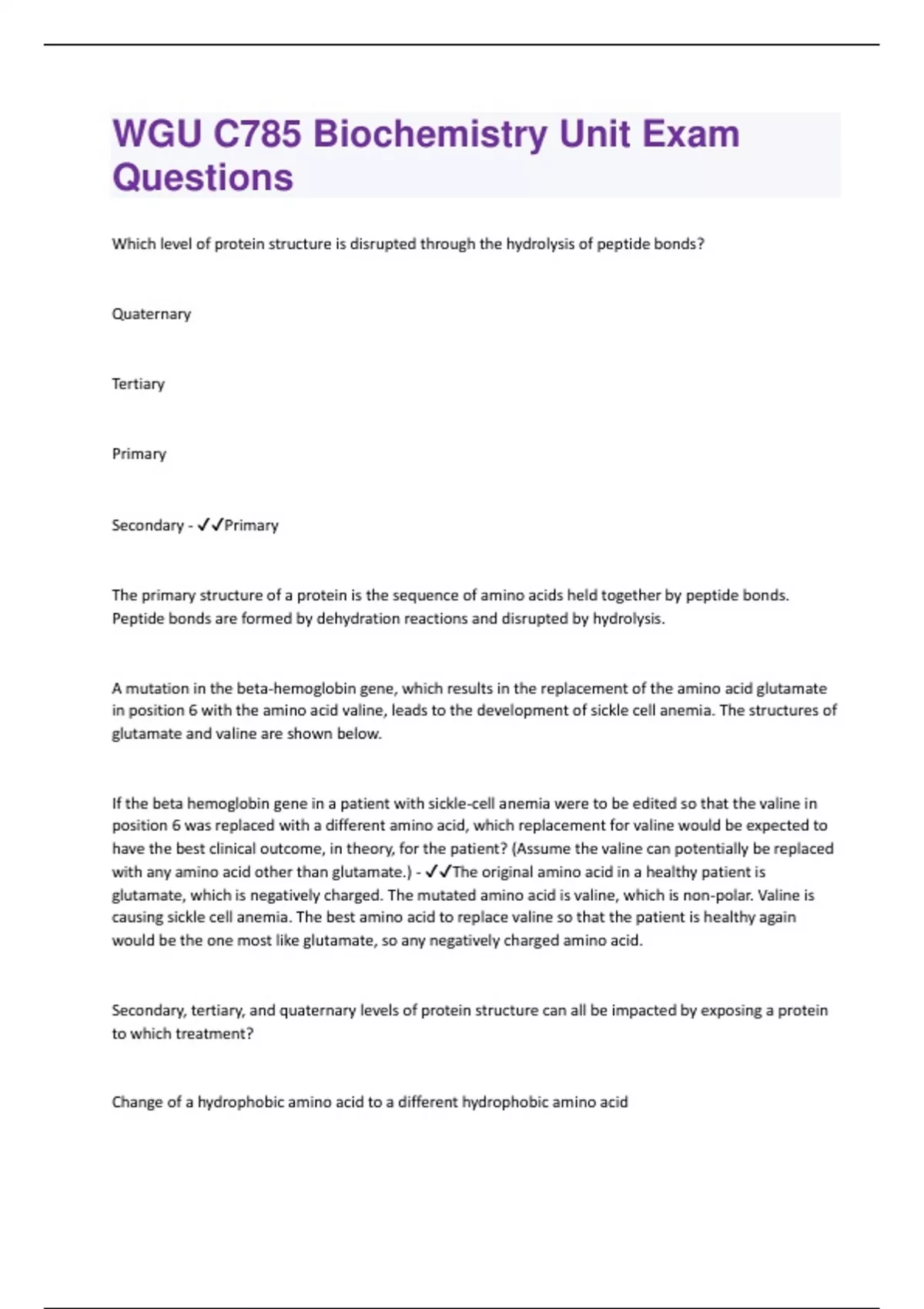 Which level of protein structure is disrupted through the hydrolysis of peptide bonds? Quaternary Tertiary Primary Secondary - Primary The primary structure of a protein is the sequence of amino acids held together by peptide bonds. Peptide bonds are formed by dehydration reactions and disrupted by hydrolysis. A mutation in the beta-hemoglobin gene, which results in the replacement of the amino acid glutamate in position 6 with the amino acid valine, leads to the development of sickle cell anemia. The structures of glutamate and valine are shown below. If the beta hemoglobin gene in a patient with sickle-cell anemia were to be edited so that the valine in position 6 was replaced with a different amino acid, which replacement for valine would be expected to have the best clinical outcome, in theory, for the patient? (Assume the valine can potentially be replaced with any amino acid other than glutamate.) - The original amino acid in a healthy patient is glutamate, which is negatively charged. The mutated amino acid is valine, which is non-polar. Valine is causing sickle cell anemia. The best amino acid to replace valine so that the patient is healthy again would be the one most like glutamate, so any negatively charged amino acid. Secondary, tertiary, and quaternary levels of protein structure can all be impacted by exposing a protein to which treatment? Change of a hydrophobic amino acid to a different hydrophobic amino acidAddition of a reducing agent Placement of the protein in a solution with a low pH Increase in the concentration of the protein in solution - Placement of the protein in a solution with a low pH