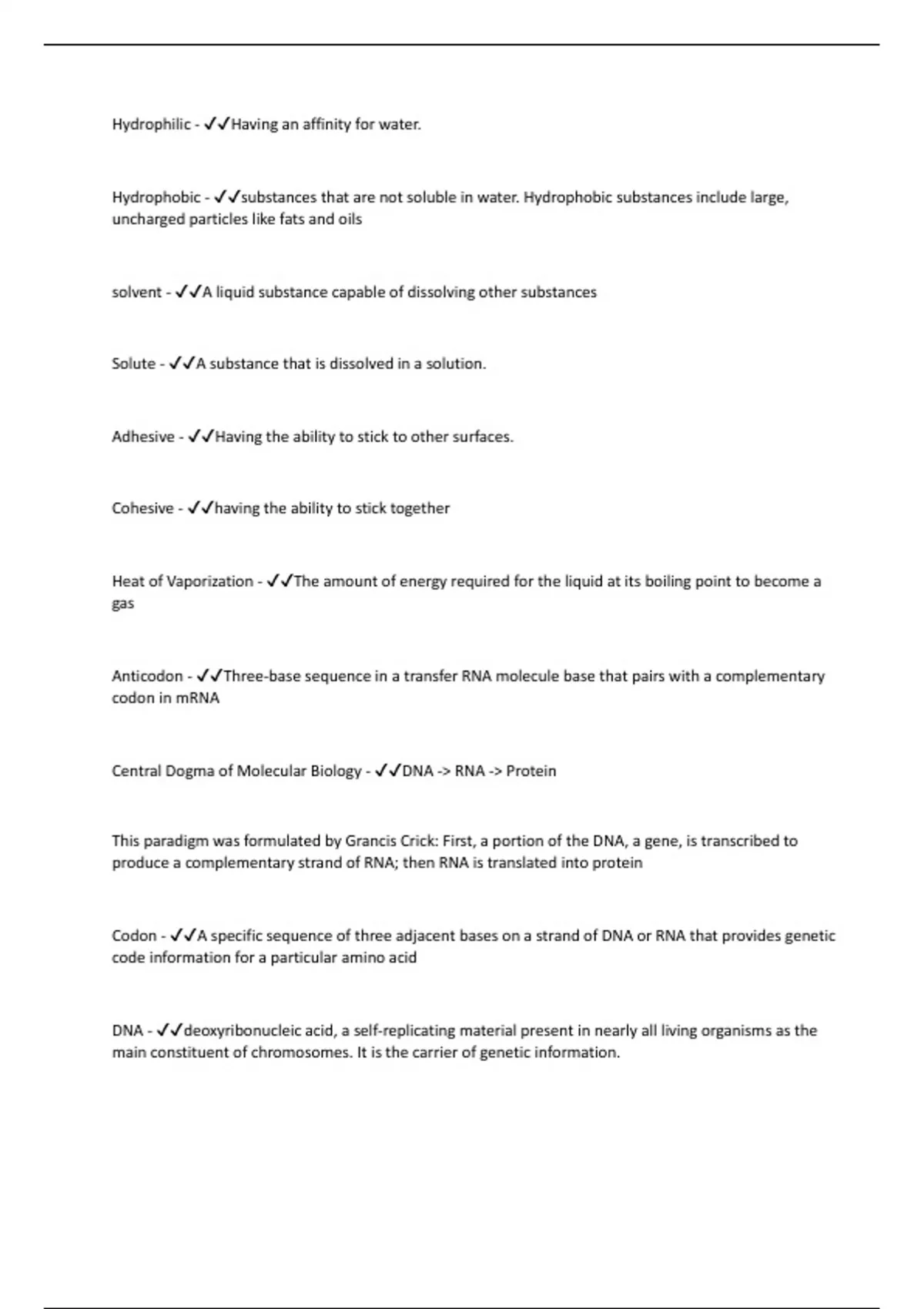 Hydrophilic - Having an affinity for water. Hydrophobic - substances that are not soluble in water. Hydrophobic substances include large, uncharged particles like fats and oils solvent - A liquid substance capable of dissolving other substances Solute - A substance that is dissolved in a solution. Adhesive - Having the ability to stick to other surfaces. Cohesive - having the ability to stick together Heat of Vaporization - The amount of energy required for the liquid at its boiling point to become a gas Anticodon - Three-base sequence in a transfer RNA molecule base that pairs with a complementary codon in mRNA Central Dogma of Molecular Biology - DNA -> RNA -> Protein This paradigm was formulated by Grancis Crick: First, a portion of the DNA, a gene, is transcribed to produce a complementary strand of RNA; then RNA is translated into protein Codon - A specific sequence of three adjacent bases on a strand of DNA or RNA that provides genetic code information for a particular amino acid DNA - deoxyribonucleic acid, a self-replicating material present in nearly all living organisms as the main constituent of chromosomes. It is the carrier of genetic information. Dominant Allele - an allele that dominates or masks the presence of another allele and is fully expressed Dominant trait - the trait that is expressed from a dominant allele Recessive allele - the trait that is completely masked and is not expressed Recessive trait - a genetic factor that is blocked by the presence of a dominant factor Epigenetics - the study of environmental influences on gene expression that occur without a DNA change Exons - expressed sequence of DNA; codes for a protein Gene Expression - process by which a gene produces its product and the product carries out its function Histones - they are the chief protein components of chromatin, acting as spools around which DNA winds, and playing a role in gene regulation Inheritance - is the passage of hereditary traits from one generation to the next Introns - Non-coding segments of nucleic acid that lie between coding sequences