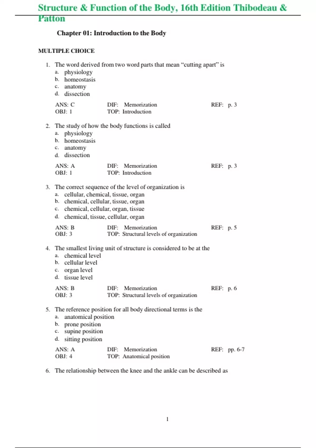 Structure & Function of the Body, 16th Edition Thibodeau & Patton Chapter 01: Introduction to the Body MULTIPLE CHOICE 1. The word derived from two word parts that mean “cutting apart” is a. physiology b. homeostasis c. anatomy d. dissection ANS: C DIF: Memorization REF: p. 3 OBJ: 1 TOP: Introduction 2. The study of how the body functions is called a. physiology b. homeostasis c. anatomy d. dissection ANS: A DIF: Memorization REF: p. 3 OBJ: 1 TOP: Introduction 3. The correct sequence of the level of organization is a. cellular, chemical, tissue, organ b. chemical, cellular, tissue, organ c. chemical, cellular, organ, tissue d. chemical, tissue, cellular, organ ANS: B DIF: Memorization REF: p. 5 OBJ: 3 TOP: Structural levels of organization 4. The smallest living unit of structure is considered to be at the a. chemical level b. cellular level c. organ level d. tissue level ANS: B DIF: Memorization REF: p. 6 OBJ: 3 TOP: Structural levels of organization 5. The reference position for all body directional terms is the a. anatomical position b. prone position c. supine position d. sitting position ANS: A DIF: Memorization REF: pp. 6-7 OBJ: 4 TOP: Anatomical position 6. The relationship between the knee and the ankle can be described as a. the knee is inferior to the ankle b. the knee is distal to the ankle c. the knee is proximal to the ankle d. both a and b above ANS: C DIF: Application REF: pp. 7-8 OBJ: 5 TOP: Anatomical directions 7. The relationship between the heart and the lungs can be described as a. the heart is distal to the lungs b. the heart is medial to the lungs c. the heart is lateral to the lungs d. both a and c above ANS: B DIF: Application REF: p. 7 OBJ: 5 TOP: Anatomical directions 8. The term most opposite proximal is a. medial b. superior c. anterior d. distal ANS: D DIF: Memorization REF: p. 7 OBJ: 5 TOP: Anatomical directions 9. Because humans walk in an upright position, the two terms that can be used interchangeably are a. posterior and ventral b. posterior and inferior c. posterior and superficial d. posterior and dorsal ANS: D DIF: Memorization REF: p. 7 OBJ: 5 TOP: Anatomical directions 10. The term most opposite medial is a. dorsal b. lateral c. superficial d. none of the above ANS: B DIF: Memorization REF: p. 7 OBJ: 5 TOP: Anatomical directions 11. The relationship between the skin and the muscles can be described as a. the skin is superficial to the muscle b. the muscle is superficial to the skin c. the muscle is deep to the skin d. both a and c above ANS: D DIF: Memorization REF: p. 7 OBJ: 3 TOP: Anatomical directions 12. A cut dividing the body into anterior and posterior portions is called a a. sagittal section b. frontal section c. transverse section d. none of the above ANS: B DIF: Memorization REF: p. 9 OBJ: 5 TOP: Planes or body sections 13. A cut dividing the body into upper and lower portions is called a a. sagittal section b. frontal section c. transverse section d. coronal section ANS: C DIF: Memorization REF: p. 9 OBJ: 5 TOP: Planes or body sections 14. A cut dividing the body into right and left portions is called a a. sagittal section b. frontal section c. transverse section d. coronal section ANS: A DIF: Memorization REF: pp. 8-9 OBJ: 5 TOP: Planes or body sections 15. The mediastinum is part of the a. dorsal cavity b. ventral cavity c. abdominal cavity d. both b and c above ANS: B DIF: Memorization REF: p. 9 OBJ: 6 TOP: Body cavities 16. The two major cavities of the body are the a. dorsal and ventral b. thoracic and abdominal c. pleural and mediastinum d. none of the above ANS: A DIF: Memorization REF: p. 9 OBJ: 6 TOP: Body cavities 17. The diaphragm divides the a. dorsal from the ventral cavity b. abdominal from the pelvic cavity c. thoracic from the abdominal cavity d. pleural from the mediastinum ANS: C DIF: Memorization REF: p. 9 OBJ: 6 TOP: Body cavities 18. The upper abdominopelvic regions include the a. right and left hypochondriac and umbilical b. right and left lumbar and umbilical c. right and left iliac and epigastric d. right and left hypochondriac and epigastric ANS: D DIF: Memorization REF: p. 10 OBJ: 7 TOP: Body cavities 19. The middle abdominopelvic regions include the a. right and left lumbar and umbilical b. right and left lumbar and epigastric c. right and left iliac and hypogastric d. right and left iliac and umbilical ANS: A DIF: Memorization REF: p. 10 OBJ: 7 TOP: Body cavities 20. The lower abdominopelvic regions include the a. right and left iliac and umbilical b. right and left lumbar and epigastric c. right and left lumbar and hypogastric d. right and left iliac and hypogastric ANS: D DIF: Memorization REF: p. 10 OBJ: 7 TOP: Body cavities 21. The brain is in the a. ventral cavity b. cranial cavity c. mediastinum d. none of the above ANS: B DIF: Memorization REF: p. 10 OBJ: 6 TOP: Body cavities 22. The spinal cavity is part of the a. dorsal cavity b. ventral cavity c. cranial cavity d. none of the above ANS: A DIF: Memorization REF: p. 9 OBJ: 6 TOP: Body cavities 23. The left upper quadrant of the abdominopelvic cavity includes all of the a. left lumbar region b. left iliac region c. left hypochondriac region d. left inguinal region ANS: C DIF: Application REF: p. 10 OBJ: 7 TOP: Body cavities 24. Using the maintaining of a constant temperature in a building as an example of a feedback loop, the thermometer would be an example of a(n) a. sensor b. control center c. effector d. positive feedback loop ANS: A DIF: Memorization REF: p. 14 OBJ: 9 TOP: The balance of body functions 25. Using the maintaining of a constant temperature in a building as an example of a feedback loop, the furnace would be an example of a(n) a. sensor b. control center c. effector d. positive feedback loop ANS: C DIF: Memorization REF: p. 14 OBJ: 9 TOP: The balance of body functions 26. Using the maintaining of a constant temperature in a building as an example of a feedback loop, the thermostat would be an example of a(n) a. sensor b. control cen