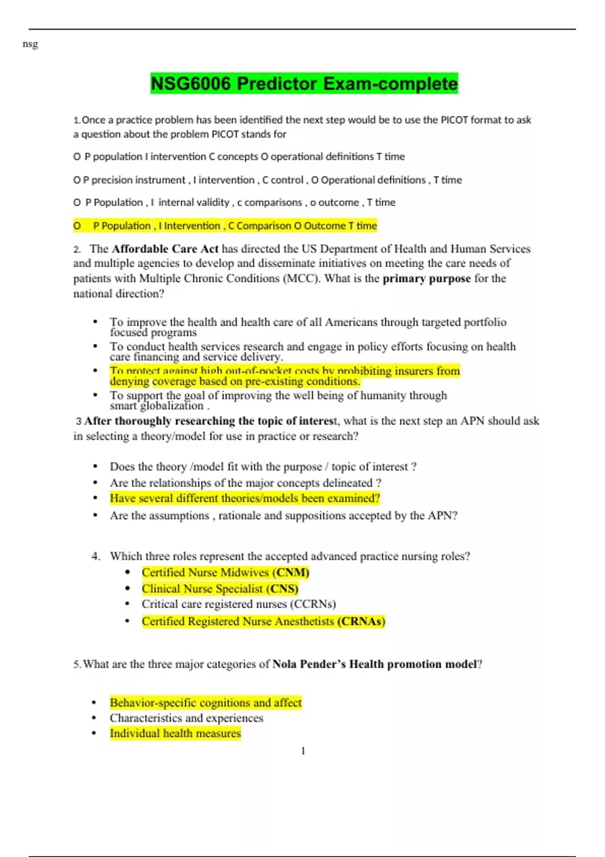 NSG6006 Predictor Exam-complete 1. Once a practice problem has been identified the next step would be to use the PICOT format to ask a question about the problem PICOT stands for O P population I intervention C concepts O operational definitions T time O P precision instrument , I intervention , C control , O Operational definitions , T time O P Population , I internal validity , c comparisons , o outcome , T time O P Population , I Intervention , C Comparison O Outcome T time 2. The Affordable Care Act has directed the US Department of Health and Human Services and multiple agencies to develop and disseminate initiatives on meeting the care needs of patients with Multiple Chronic Conditions (MCC). What is the primary purpose for the national direction? • To improve the health and health care of all Americans through targeted portfolio focused programs • To conduct health services research and engage in policy efforts focusing on health care financing and service delivery. • To protect against high out-of-pocket costs by prohibiting insurers from denying coverage based on pre-existing conditions. • To support the goal of improving the well being of humanity through smart globalization . 3 After thoroughly researching the topic of interest, what is the next step an APN should ask in selecting a theory/model for use in practice or research? • Does the theory /model fit with the purpose / topic of interest ? • Are the relationships of the major concepts delineated ? • Have several different theories/models been examined? • Are the assumptions , rationale and suppositions accepted by the APN? 4. Which three roles represent the accepted advanced practice nursing roles? • Certified Nurse Midwives (CNM) • Clinical Nurse Specialist (CNS) • Critical care registered nurses (CCRNs) • Certified Registered Nurse Anesthetists (CRNAs) 5. What are the three major categories of Nola Pender’s Health promotion model? • Behavior-specific cognitions and affect • Characteristics and experiences • Individual health measures • Behavioral outcomes 6. Which theorist/s identifies caritive factors as a value system, faith-hope and sensitivity to self and others? This describes which of the following theories? • Dorothea Orem • Paterson and Zderad • Jean Watson theory of human caring • Margaret Newman 7. What set of components is essential in a scientific theory ? • Interrelated concepts, definitions, and propositions. • Interrelated statements which assume all the relationship to be true • Statements that are based on the authors opinions and experience only • Propositions and constructs that are not necessarily tied together 8. The term advanced nursing practice (APN)includes nurses who are : • Certified APRNs with a minimum of a master’s degree • Graduates of programs in nursing education or a health-related field • Nurses certified in nursing informatics, nurse administration , policy or public health • Registered nurses with specialized post baccalaureate training 9. To meet Medicare’s coverage requirements , the nurse practitioners’ services must be • Provided subject to states restrictions and supervision requirements • Provided under direct supervision • Provided in rural health clinic or federally qualified health center • Billed through a physician directed clinic , health agency or hospital 10. A 20-year-old female comes to the primary care clinic with clinical findings consistent with acute bronchitis. She is sexually active with a male partner, although she states prior to this relationship she did have two sexual partners. Her menses occurs every 28 days and is regular. An example of a primary prevention activity for this patient is: • Screening for a sexually transmitted disease • Prescribing therapies to decrease a cough • Obtaining a Papanicolaou (PAP) test • Counseling about safer sexual practices 11. Which agency’s initiative establishes national health promotion and prevention efforts and establishes benchmarks for monitoring the progress of health among Americans over a 10-year timeframe? • Agency for health care research and quality • National institutes of Heath • Centers for Disease Control and Prevention (CDC) • Institute of Medicine 12. Development of the first pediatric nurse practitioner program at the University of Colorado in 1965 is credited to which two individuals? • Harry Fox, MD • Henry Silver, MD • Luella Jackson, RN • Loretta Ford , RN • Carla Brown, ARNP 13. Raynaud phenomenon is classified as a type III hypersensitivity reaction and is due to: • Immune complexes that are deposited in capillary beds, blocking circulation • Mast cells that are bound to specific endothelial receptors, causing them to degranulate and creating a localized inflammatory reaction that occludes capillary circulation • Cytotoxic T cells that attack and destroy the capillaries so that they are unable to perfuse local tissue • Antibodies that detect the capillaries as foreign protein and destroy them using lysosomal enzymes and toxic oxygen species. 14. The nurse practitioner is caring for a 21-year-old female who presents with a pruritic, erythematous rash matching pattern of her sandal straps. The nurse practitioner advises the patient to avoid scratching the area due to the risk of developing a secondary infection. The NP understands that the most likely etiology of secondary skins infections is caused by which organism. • Streptococcus pneumoniae • Proteus • Candida albicans • Staphylococcus aureus 15. How can the APN best influence development and passage of a specific health policy agenda? • Develop a health policy proposal and independently present it to the house of representative • Partner with a legislator to sponsor a bill despite unrelated committed assignment • Determine the best fit between legislative agenda, supporting organizations, and health policy issue. • Join a n