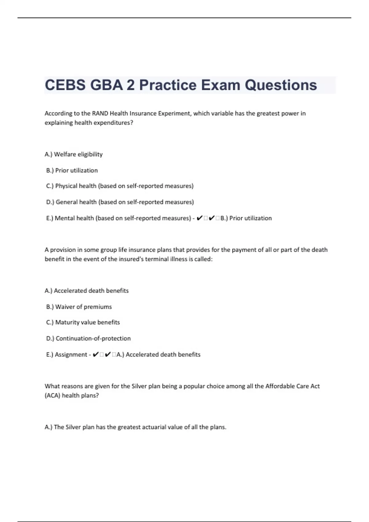 According to the RAND Health Insurance Experiment, which variable has the greatest power in explaining health expenditures? A.) Welfare eligibility B.) Prior utilization C.) Physical health (based on self-reported measures) D.) General health (based on self-reported measures) E.) Mental health (based on self-reported measures) - ️️B.) Prior utilization A provision in some group life insurance plans that provides for the payment of all or part of the death benefit in the event of the insured's terminal illness is called: A.) Accelerated death benefits B.) Waiver of premiums C.) Maturity value benefits D.) Continuation-of-protection E.) Assignment - ️️A.) Accelerated death benefits What reasons are given for the Silver plan being a popular choice among all the Affordable Care Act (ACA) health plans? A.) The Silver plan has the greatest actuarial value of all the plans.