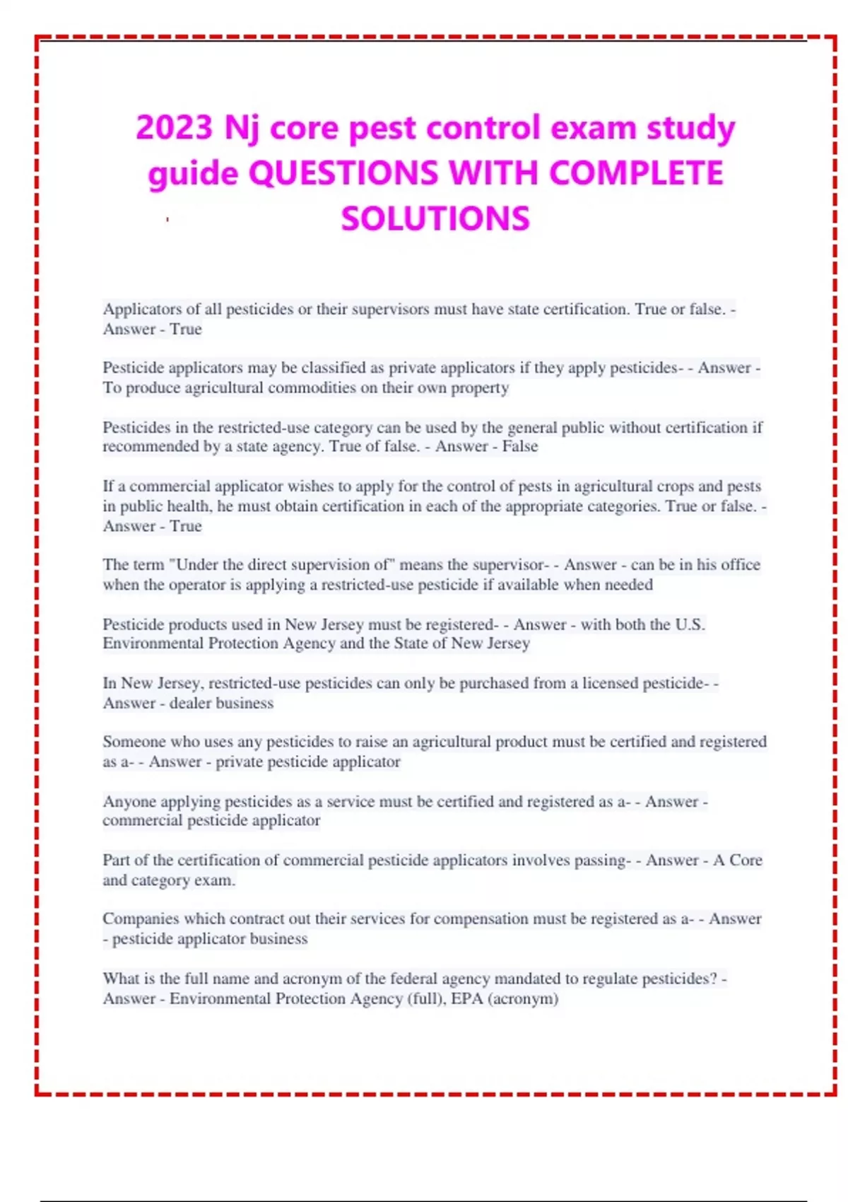 2023 Nj core pest control exam study guide QUESTIONS WITH COMPLETE SOLUTIONS Applicators of all pesticides or their supervisors must have state certification. True or false. - Answer - True Pesticide applicators may be classified as private applicators if they apply pesticides- - Answer - To produce agricultural commodities on their own property Pesticides in the restricted-use category can be used by the general public without certification if recommended by a state agency. True of false. - Answer - False If a commercial applicator wishes to apply for the control of pests in agricultural crops and pests in public health, he must obtain certification in each of the appropriate categories. True or false. - Answer - True The term "Under the direct supervision of" means the supervisor- - Answer - can be in his office when the operator is applying a restricted-use pesticide if available when needed Pesticide products used in New Jersey must be registered- - Answer - with both the U.S. Environmental Protection Agency and the State of New Jersey In New Jersey, restricted-use pesticides can only be purchased from a licensed pesticide- - Answer - dealer business Someone who uses any pesticides to raise an agricultural product must be certified and registered as a- - Answer - private pesticide applicator Anyone applying pesticides as a service must be certified and registered as a- - Answer - commercial pesticide applicator Part of the certification of commercial pesticide applicators involves passing- - Answer - A Core and category exam. Companies which contract out their services for compensation must be registered as a- - Answer - pesticide applicator business What is the full name and acronym of the federal agency mandated to regulate pesticides? - Answer - Environmental Protection Agency (full), EPA (acronym) What are regulations? - Answer - Regulations are interpretations of the law and have the force of law What is the full name and acronym for the law EPA uses to manage pesticides? - Answer - Federal Insecticide, Fungicide, and Rodenticide Act (ful). FIFRA (acronym) Define reentry time. - Answer - Reentry time is the time immediately following application of a pesticide to a treated area when unprotected workers may not enter. Which federal agency sets food tolerances for pesticides? Which federal agency enforces these tolerances? - Answer - EPA sets food tolerances; FDA enforces food tolerances FIFRA allows states to establish standards. What kind of standards? - Answer - More strict What is the purpose of the tolerance program? - Answer - The tolerance program is to ensure that U.S. consumers are not exposed to unsafe food pesticide residue levels The regulations interpreting the Transportation Safety Act are contained in 49 CFR. What do these regulations do? - Answer - The regulations in 49 CFR cover any safety aspect of transporting hazardous materials, including the packing, repacking, placarding, and routing of such materials Which federal agency determines what species are endangered? - Answer - Fish and Wildlife Service (FWS) of the Department of the Interior Who ultimately bears the responsibility of protecting endangered species from pesticides? - Answer - You, the applicator The inherent ability of pesticide to cause injury or poison organisms is called - Answer - toxicity In an LD50, equal to 68 mg/kg the 68 milligrams - Answer - pesticide The oral LD50 level which represents a highly toxic pesticide is- - Answer - 46mg/kg The probability of a pesticide causing adverse effects to an organism is called- - Answer - risk It is best to avoid the use of those pesticides which can accumulate and cause undesirable effects in the bodies of desirable organisms. True or false. - Answer - True All pesticides can pass through the skin to enter the blood and significantly affect the nervous system of man. True or false. - Answer - False The kind of toxicity that results from small, repeated exposures to a pesticide over a period of time is called - Answer - chronic toxicity