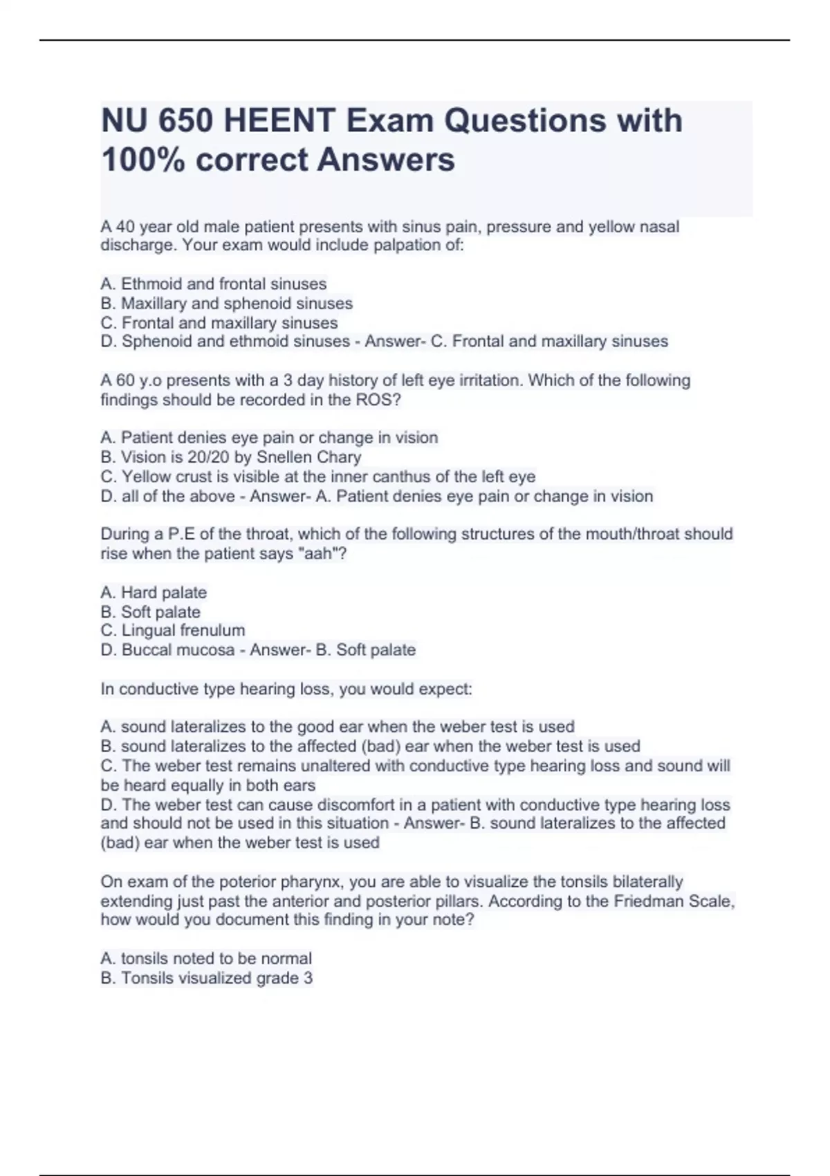 nu 650 heent exam questions with 100 correct answ