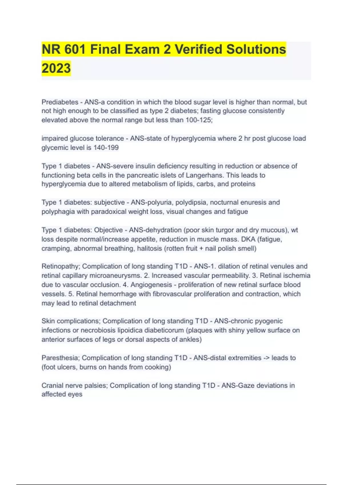 NR 601 Final Exam 2 Verified Solutions 2023 Prediabetes - ANS-a condition in which the blood sugar level is higher than normal, but not high enough to be classified as type 2 diabetes; fasting glucose consistently elevated above the normal range but less than 100-125;