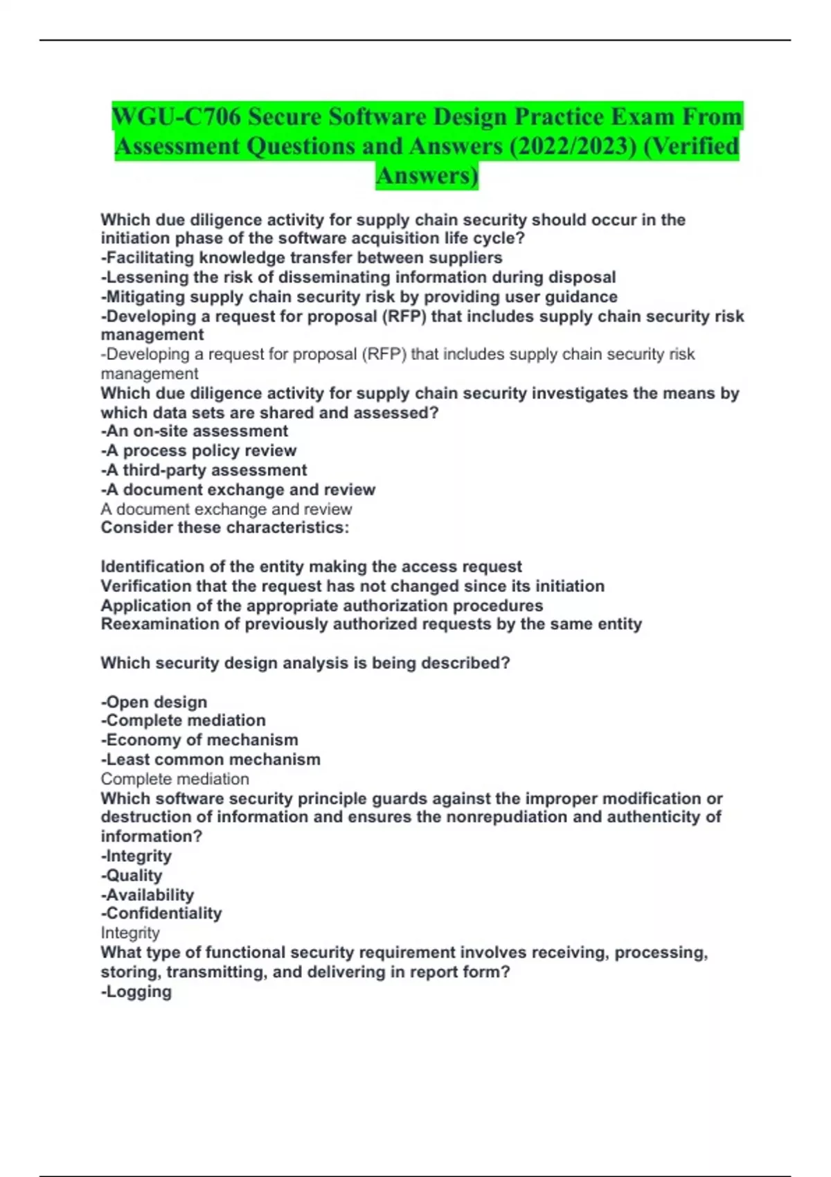 WGU-C706 Secure Software Design Practice Exam From Assessment Questions and Answers (2022/2023) (Verified Answers) Which due diligence activity for supply chain security should occur in the initiation phase of the software acquisition life cycle? -Facilitating knowledge transfer between suppliers -Lessening the risk of disseminating information during disposal -Mitigating supply chain security risk by providing user guidance -Developing a request for proposal (RFP) that includes supply chain security risk management -Developing a request for proposal (RFP) that includes supply chain security risk management Which due diligence activity for supply chain security investigates the means by which data sets are shared and assessed? -An on-site assessment -A process policy review -A third-party assessment -A document exchange and review A document exchange and review Consider these characteristics: Identification of the entity making the access request Verification that the request has not changed since its initiation Application of the appropriate authorization procedures Reexamination of previously authorized requests by the same entity Which security design analysis is being described? -Open design -Complete mediation -Economy of mechanism -Least common mechanism Complete mediation Which software security principle guards against the improper modification or destruction of information and ensures the nonrepudiation and authenticity of information? -Integrity -Quality -Availability -Confidentiality Integrity What type of functional security requirement involves receiving, processing, storing, transmitting, and delivering in report form? -Logging