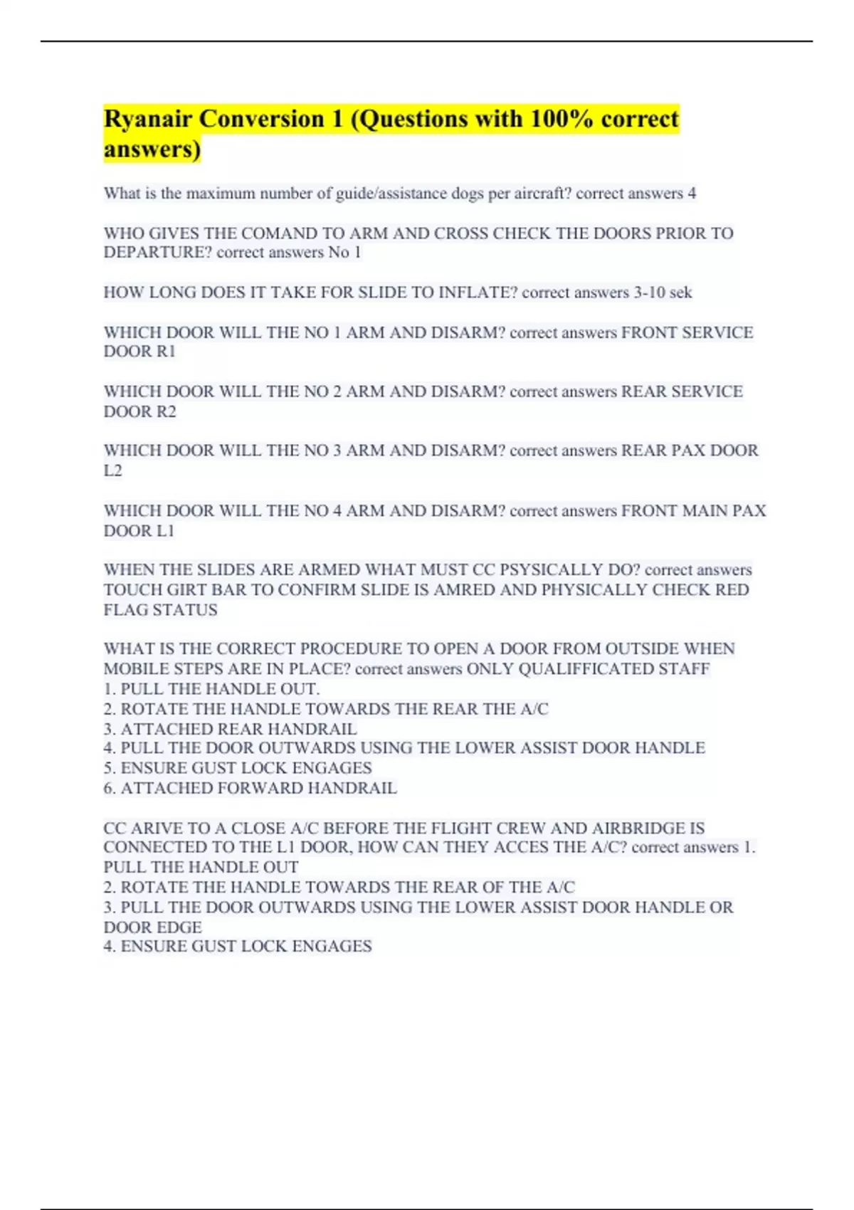 What is the maximum number of guide/assistance dogs per aircraft? correct answers 4 WHO GIVES THE COMAND TO ARM AND CROSS CHECK THE DOORS PRIOR TO DEPARTURE? correct answers No 1 HOW LONG DOES IT TAKE FOR SLIDE TO INFLATE? correct answers 3-10 sek WHICH DOOR WILL THE NO 1 ARM AND DISARM? correct answers FRONT SERVICE DOOR R1 WHICH DOOR WILL THE NO 2 ARM AND DISARM? correct answers REAR SERVICE DOOR R2 WHICH DOOR WILL THE NO 3 ARM AND DISARM? correct answers REAR PAX DOOR L2 WHICH DOOR WILL THE NO 4 ARM AND DISARM? correct answers FRONT MAIN PAX DOOR L1 WHEN THE SLIDES ARE ARMED WHAT MUST CC PSYSICALLY DO? correct answers TOUCH GIRT BAR TO CONFIRM SLIDE IS AMRED AND PHYSICALLY CHECK RED FLAG STATUS WHAT IS THE CORRECT PROCEDURE TO OPEN A DOOR FROM OUTSIDE WHEN MOBILE STEPS ARE IN PLACE? correct answers ONLY QUALIFFICATED STAFF 1. PULL THE HANDLE OUT. 2. ROTATE THE HANDLE TOWARDS THE REAR THE A/C 3. ATTACHED REAR HANDRAIL 4. PULL THE DOOR OUTWARDS USING THE LOWER ASSIST DOOR HANDLE 5. ENSURE GUST LOCK ENGAGES 6. ATTACHED FORWARD HANDRAIL CC ARIVE TO A CLOSE A/C BEFORE THE FLIGHT CREW AND AIRBRIDGE IS CONNECTED TO THE L1 DOOR, HOW CAN THEY ACCES THE A/C? correct answers 1. PULL THE HANDLE OUT 2. ROTATE THE HANDLE TOWARDS THE REAR OF THE A/C 3. PULL THE DOOR OUTWARDS USING THE LOWER ASSIST DOOR HANDLE OR DOOR EDGE 4. ENSURE GUST LOCK ENGAGES