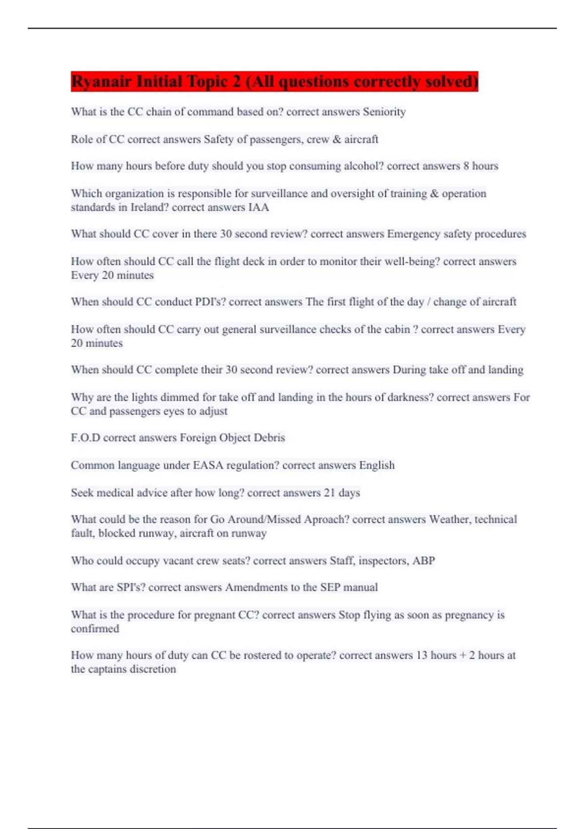 What is the CC chain of command based on? correct answers Seniority Role of CC correct answers Safety of passengers, crew & aircraft How many hours before duty should you stop consuming alcohol? correct answers 8 hours Which organization is responsible for surveillance and oversight of training & operation standards in Ireland? correct answers IAA What should CC cover in there 30 second review? correct answers Emergency safety procedures How often should CC call the flight deck in order to monitor their well-being? correct answers Every 20 minutes When should CC conduct PDI's? correct answers The first flight of the day / change of aircraft How often should CC carry out general surveillance checks of the cabin ? correct answers Every 20 minutes When should CC complete their 30 second review? correct answers During take off and landing Why are the lights dimmed for take off and landing in the hours of darkness? correct answers For CC and passengers eyes to adjust F.O.D correct answers Foreign Object Debris Common language under EASA regulation? correct answers English Seek medical advice after how long? correct answers 21 days What could be the reason for Go Around/Missed Aproach? correct answers Weather, technical fault, blocked runway, aircraft on runway Who could occupy vacant crew seats? correct answers Staff, inspectors, ABP What are SPI's? correct answers Amendments to the SEP manual What is the procedure for pregnant CC? correct answers Stop flying as soon as pregnancy is confirmed How many hours of duty can CC be rostered to operate? correct answers 13 hours + 2 hours at the captains discretion