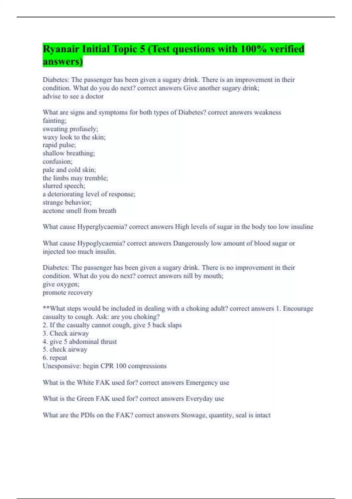 Diabetes: The passenger has been given a sugary drink. There is an improvement in their condition. What do you do next? correct answers Give another sugary drink; advise to see a doctor What are signs and symptoms for both types of Diabetes? correct answers weakness fainting; sweating profusely; waxy look to the skin; rapid pulse; shallow breathing; confusion; pale and cold skin; the limbs may tremble; slurred speech; a deteriorating level of response; strange behavior; acetone smell from breath What cause Hyperglycaemia? correct answers High levels of sugar in the body too low insuline What cause Hypoglycaemia? correct answers Dangerously low amount of blood sugar or injected too much insulin. Diabetes: The passenger has been given a sugary drink. There is no improvement in their condition. What do you do next? correct answers nill by mouth; give oxygen; promote recovery **What steps would be included in dealing with a choking adult? correct answers 1. Encourage casualty to cough. Ask: are you choking? 2. If the casualty cannot cough, give 5 back slaps 3. Check airway 4. give 5 abdominal thrust 5. check airway 6. repeat Unesponsive: begin CPR 100 compressions What is the White FAK used for? correct answers Emergency use What is the Green FAK used for? correct answers Everyday use What are the PDIs on the FAK? correct answers Stowage, quantity, seal is intact