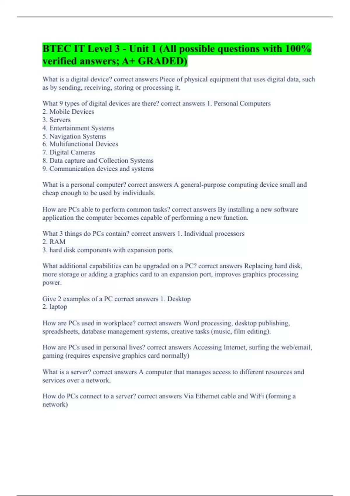 BTEC IT Level 3 - Unit 1 (All possible questions with 100% verified answers; A+ GRADED)