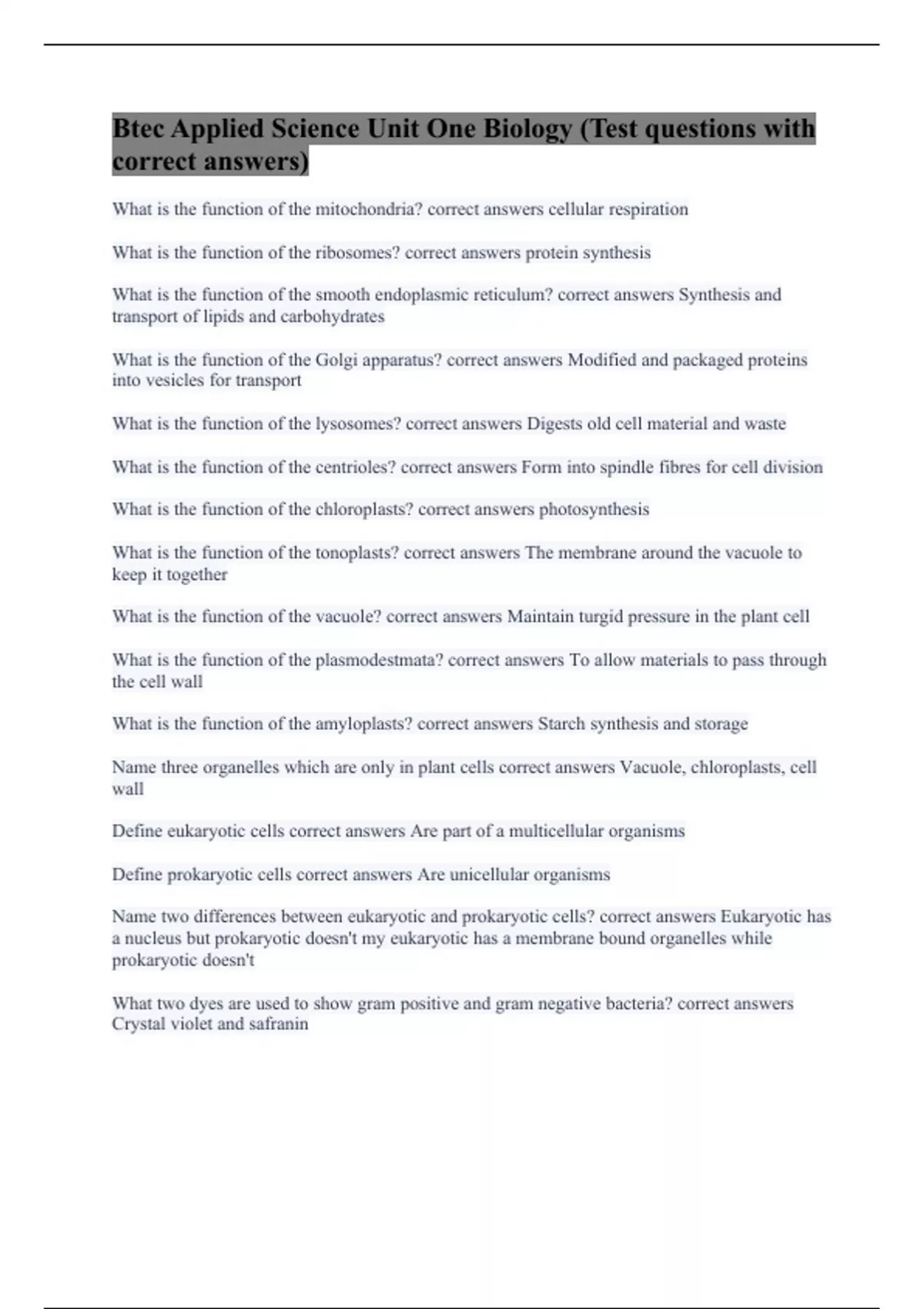 Btec Applied Science Unit One Biology (Test questions with correct answers)
