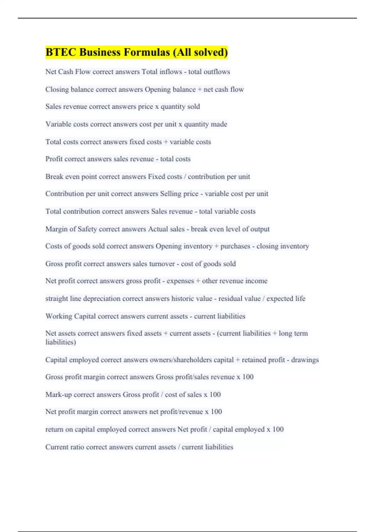 BTEC Business Formulas (All solved)