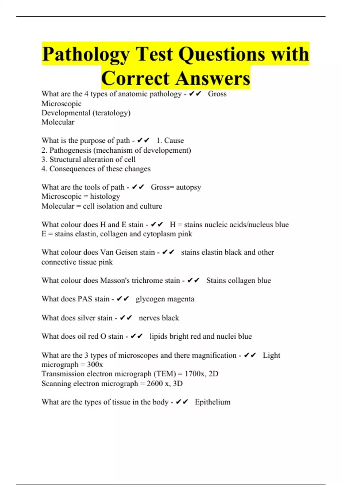 What are the 4 types of anatomic pathology - Gross Microscopic Developmental (teratology) Molecular What is the purpose of path - 1. Cause 2. Pathogenesis (mechanism of developement) 3. Structural alteration of cell 4. Consequences of these changes What are the tools of path - Gross= autopsy Microscopic = histology Molecular = cell isolation and culture What colour does H and E stain - H = stains nucleic acids/nucleus blue E = stains elastin, collagen and cytoplasm pink What colour does Van Geisen stain - stains elastin black and other connective tissue pink What colour does Masson's trichrome stain - Stains collagen blue What does PAS stain - glycogen magenta What does silver stain - nerves black What does oil red O stain - lipids bright red and nuclei blue What are the 3 types of microscopes and there magnification - Light micrograph = 300x Transmission electron micrograph (TEM) = 1700x, 2D Scanning electron micrograph = 2600 x, 3D What are the types of tissue in the body - Epithelium Connective Muscle Nevous Types of epithelia - Squamous- simple/stratified Cuboidal- simple/stratified Columnar- simple/pseudostratified Transitional Overall function of epithelium - It covers every exposed surface of the body -protective function against: mechanical damage, fluid loss and invasion of foreign bodies -metabolite function: metabolite exchange and glandular secretion Where would pseudostraitifed columnar, ciliated epithelium be - Structure determines function: Respiratory tract (trachea, larynx): important so cilia can clear mucus that traps foreign material Where would simple cuboidal epithelium be - renal distal tubules, salivary glands: protects from excessive water loss due to semi-permeability, also protects from abrasion where would simple columnar epithelium be - in the gut (colon): important for ion transport where would stratified squamous epithelium be - mouth, oesophagus, skin (keratinsed): important for protection where would transitional epithelium be found - bladder, ureters: allows cells the stretch to accomodate changes in volume of urine Where would you find simple squamous epithelium - aveoli: allows for gas exchange what are the types of muscle and there defining features - 1. Skeletal: striated, nucleus at ends of cells 2. Cardiac: ICDs, nucleus in middle of cells 3. Smooth: spindle shaped cells What are types of connective tissue and there features - Adipose: loose, chicken wire structure, designed to hold lipids Bone: dense and highly organised (osteons), strong and rigid Tendon: elongated fibres to transmit force, flattened cells, high collagen content (pink) Blood: contains lots of cells with different functions RBC - pink-red biconcave disc, anuclear Transports O2 and CO2 via Hb What are the types of leukocytes - Granulocytes = basophils, eosinophils, neutrophils Monocytes Lymphocytes = B, T, NK cells Monocyte - Mononuclear, kidney shaped nucleus, large 20-40 hr cirulcaiton time-turns to macrophage in tissue (long lived)- phagocytosis, APC, releases cytokines (TNF-alpha and IL-1) important for inflammation 2-10% of PBMC Lymphocyte - Cant differntiate B and T cells from morphology Large nucleus with little cytoplasm, variable shape and size B cell= antibody T cell= CD4- helper cells and secrete cytokines, CD8- induce apoptosis 20-40% PBMC (T cells = 60-80% B cells = 15-30%) NK cells: Large, granular 5-10% PBMC Activated when they detect low expression of MHC-1 and they induce apoptosis (important for viral infection) They recognise antigen presented on CD1d (non-classical MHC) which causes them to produce lots of cytokines Neutrophil - 2-5 lobed nucleus, small pink-purple granules Recruited by chemokines (IL-8) to area of damage to phagocytose invaders/damaged tissue. Have complement receptors on surface to detect pathogens 40-70% in blood Die after 24-72 hours in tissue Basophil - 2 lobed nucleus, large dark purple granules Can bind IgE Releases histamine, leukotrienes Often increase in number during allergic reaction Thought to be an APC to drive Th2 responses 0.1% PBMC