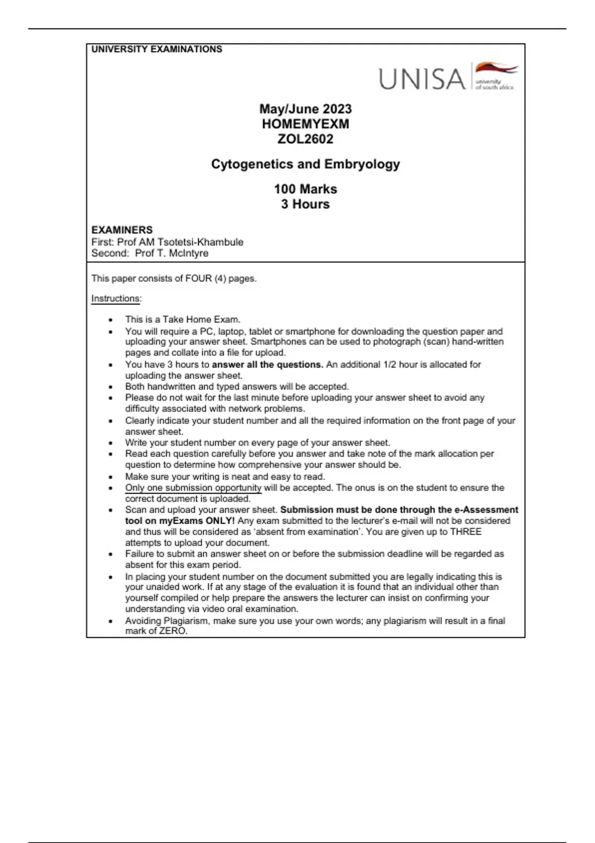 ZOL2602 Exam question paper Term 1 2023