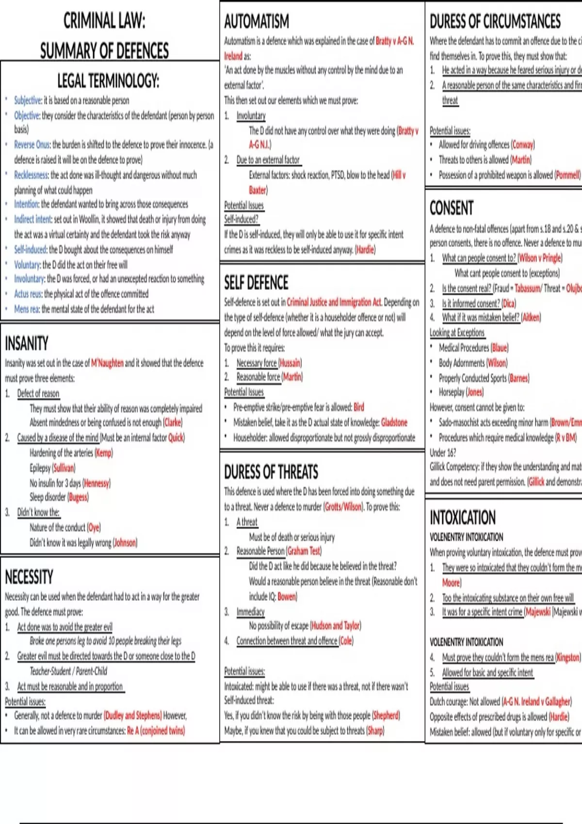 This document goes over all of the necessary defences which you will cover in OCR Law. Such as, Automatism, Duress, Intoxication and Consent. It will also be with the relevant case law in a easy to read layout.
