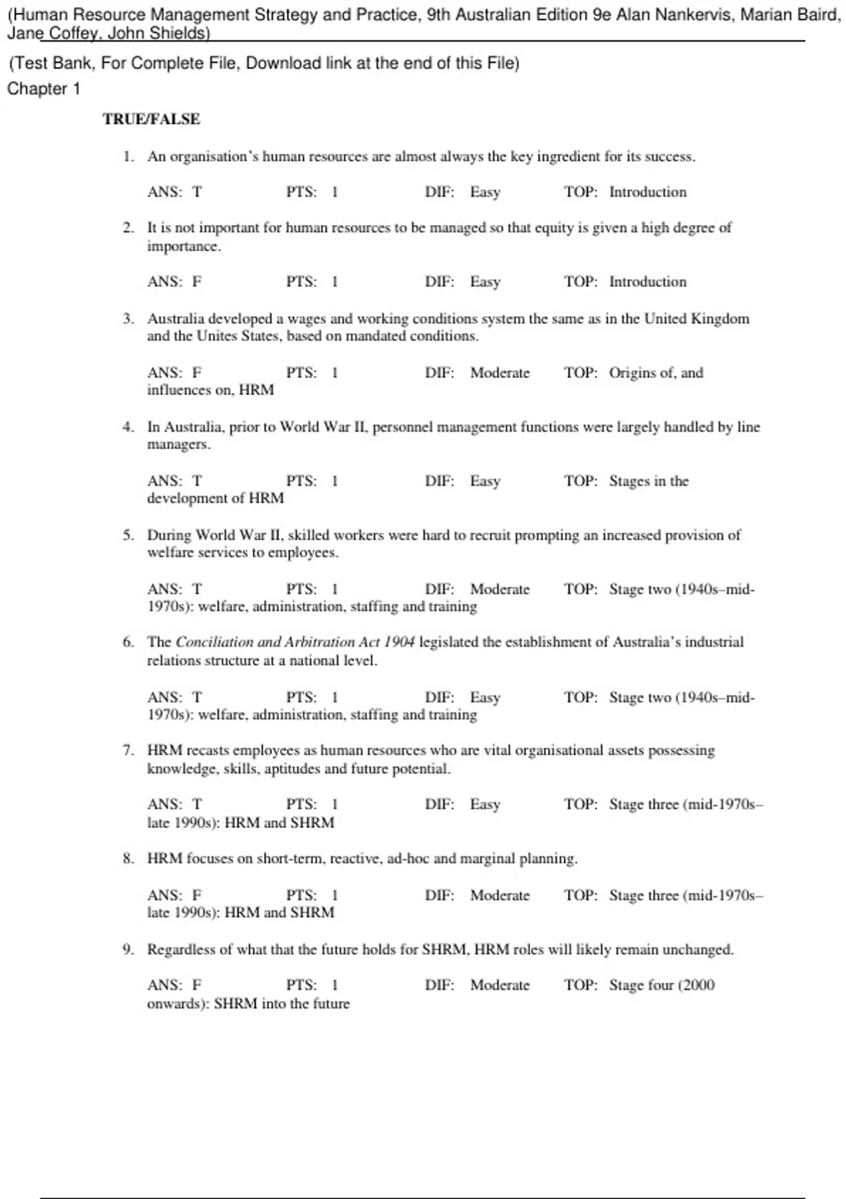 Human Resource Management Strategy and Practice, 9th Australian Edition 9e Alan Nankervis, Marian Baird, Jane Coffey, John Shields (Test Bank) Human Resource Management Strategy and Practice, 9th Australian Edition 9e Alan Nankervis, Marian Baird, Jane Coffey, John Shields (Test Bank)