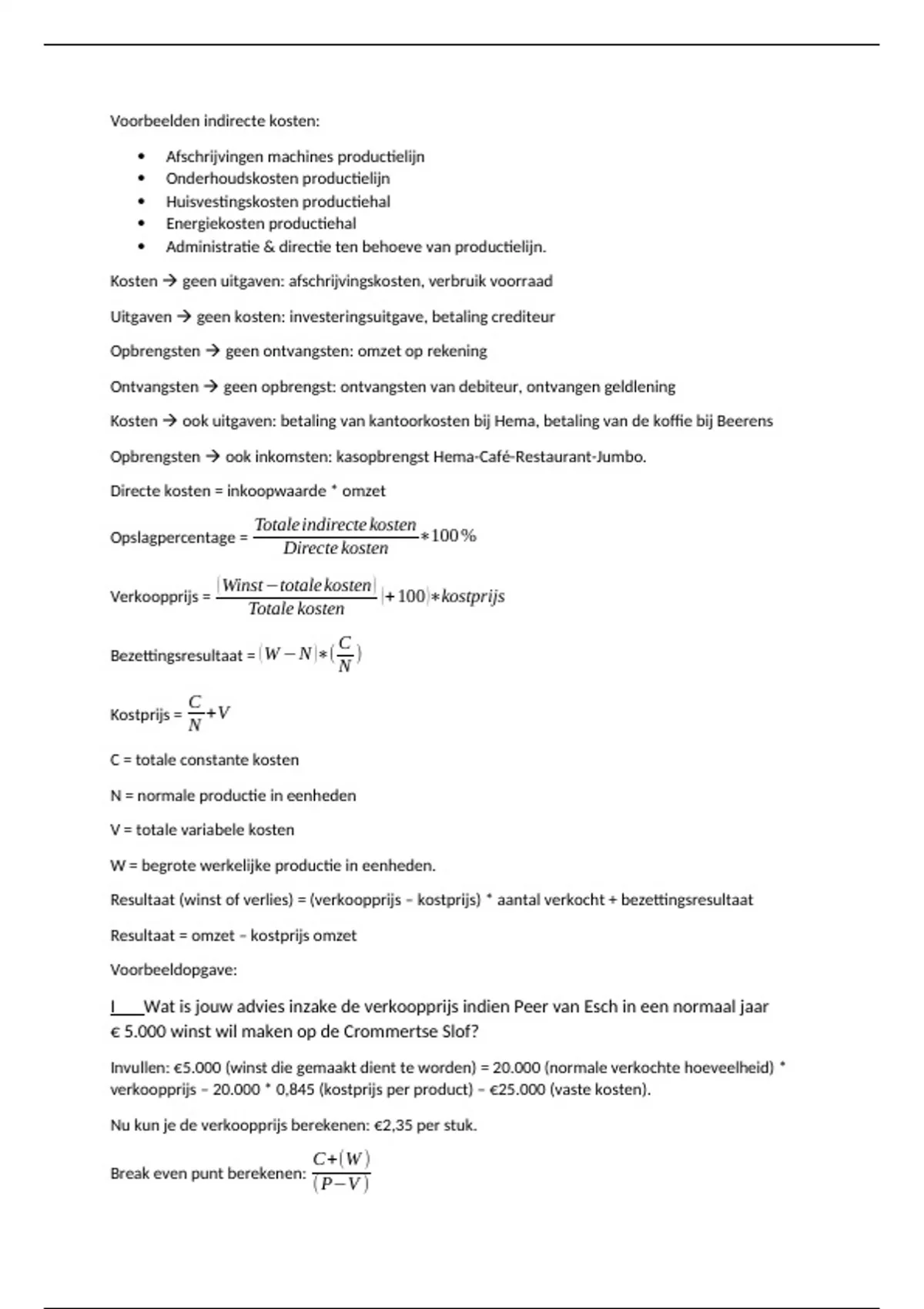Samenvatting les 3 en 4 bedrijfseconomie betreft indirecte kosten, directe kosten, formules en een voorbeeldopgave.