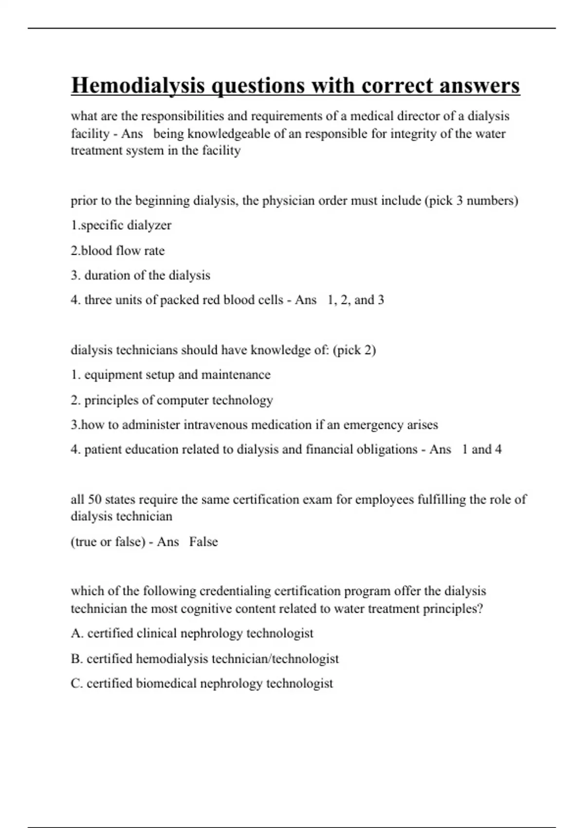 what are the responsibilities and requirements of a medical director of a dialysis facility - Ans being knowledgeable of an responsible for integrity of the water treatment system in the facility prior to the beginning dialysis, the physician order must include (pick 3 numbers) fic dialyzer flow rate 3. duration of the dialysis 4. three units of packed red blood cells - Ans 1, 2, and 3 dialysis technicians should have knowledge of: (pick 2) 1. equipment setup and maintenance 2. principles of computer technology to administer intravenous medication if an emergency arises 4. patient education related to dialysis and financial obligations - Ans 1 and 4 all 50 states require the same certification exam for employees fulfilling the role of dialysis technician (true or false) - Ans False which of the following credentialing certification program offer the dialysis technician the most cognitive content related to water treatment principles? A. certified clinical nephrology technologist B. certified hemodialysis technician/technologist