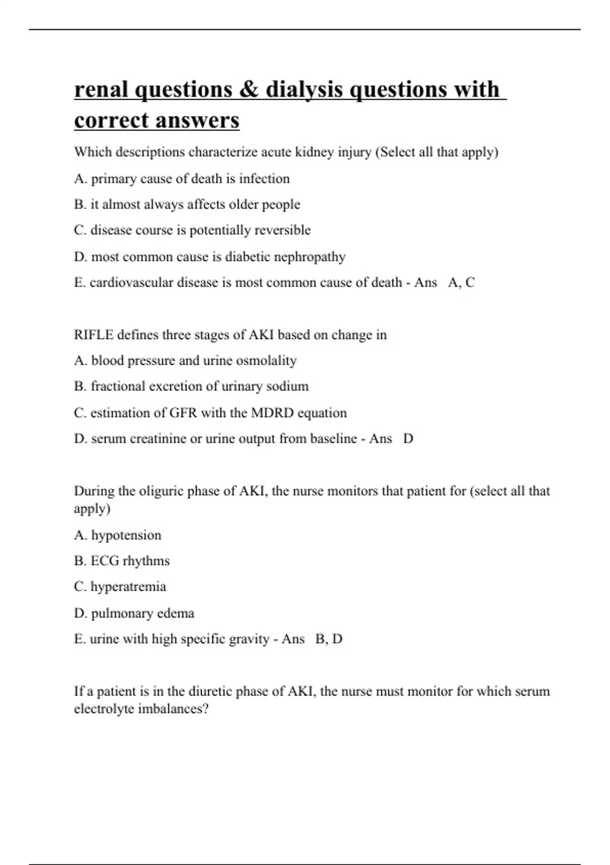 Which descriptions characterize acute kidney injury (Select all that apply) A. primary cause of death is infection B. it almost always affects older people C. disease course is potentially reversible D. most common cause is diabetic nephropathy E. cardiovascular disease is most common cause of death - Ans A, C RIFLE defines three stages of AKI based on change in A. blood pressure and urine osmolality B. fractional excretion of urinary sodium C. estimation of GFR with the MDRD equation D. serum creatinine or urine output from baseline - Ans D During the oliguric phase of AKI, the nurse monitors that patient for (select all that apply) A. hypotension B. ECG rhythms C. hyperatremia D. pulmonary edema E. urine with high specific gravity - Ans B, D If a patient is in the diuretic phase of AKI, the nurse must monitor for which serum electrolyte imbalances?