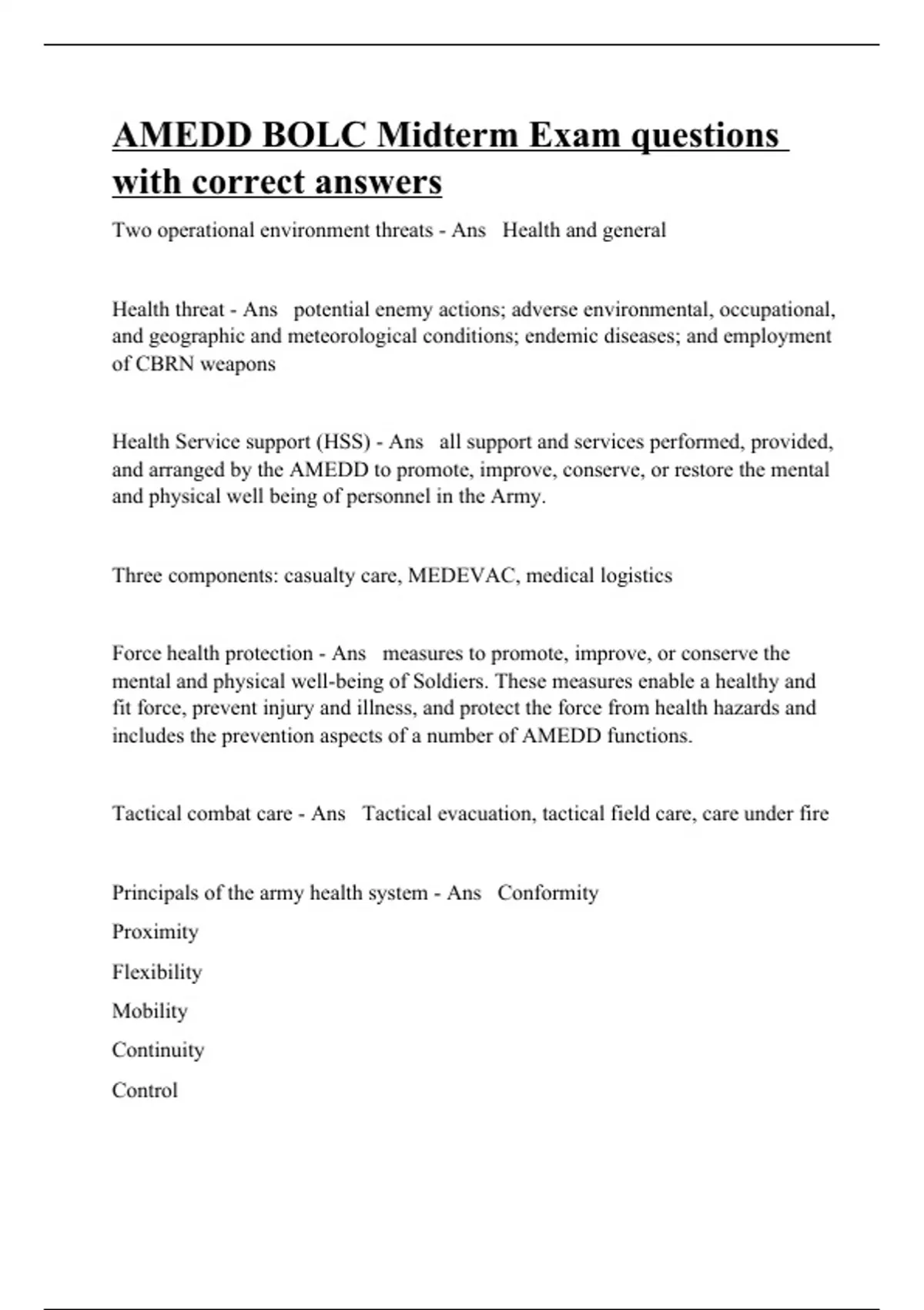 Two operational environment threats - Ans Health and general Health threat - Ans potential enemy actions; adverse environmental, occupational, and geographic and meteorological conditions; endemic diseases; and employment of CBRN weapons Health Service support (HSS) - Ans all support and services performed, provided, and arranged by the AMEDD to promote, improve, conserve, or restore the mental and physical well being of personnel in the Army. Three components: casualty care, MEDEVAC, medical logistics Force health protection - Ans measures to promote, improve, or conserve the mental and physical well-being of Soldiers. These measures enable a healthy and fit force, prevent injury and illness, and protect the force from health hazards and includes the prevention aspects of a number of AMEDD functions. Tactical combat care - Ans Tactical evacuation, tactical field care, care under fire Principals of the army health system - Ans Conformity Proximity Flexibility Mobility Continuity