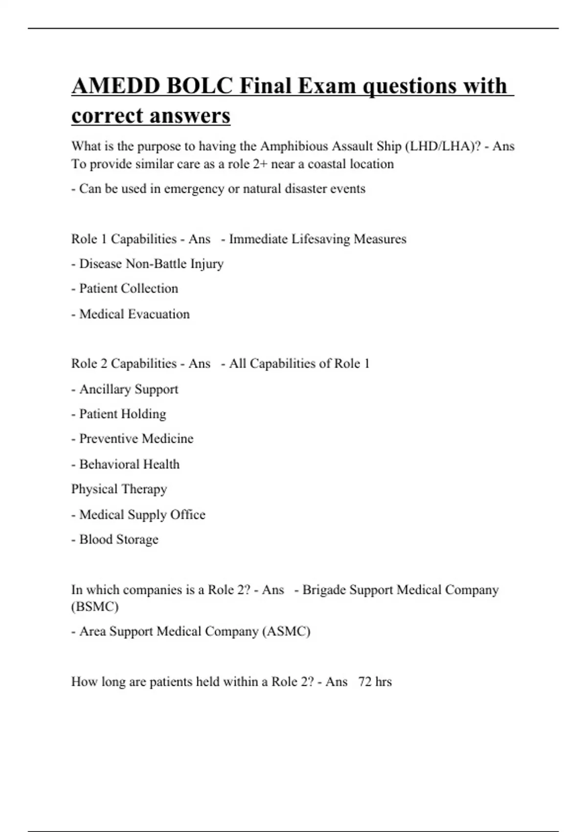 What is the purpose to having the Amphibious Assault Ship (LHD/LHA)? - Ans To provide similar care as a role 2+ near a coastal location - Can be used in emergency or natural disaster events Role 1 Capabilities - Ans - Immediate Lifesaving Measures - Disease Non-Battle Injury - Patient Collection - Medical Evacuation Role 2 Capabilities - Ans - All Capabilities of Role 1 - Ancillary Support - Patient Holding - Preventive Medicine - Behavioral Health Physical Therapy - Medical Supply Office - Blood Storage In which companies is a Role 2? - Ans - Brigade Support Medical Company (BSMC) - Area Support Medical Company (ASMC) How long are patients held within a Role 2? - Ans 72 hrs