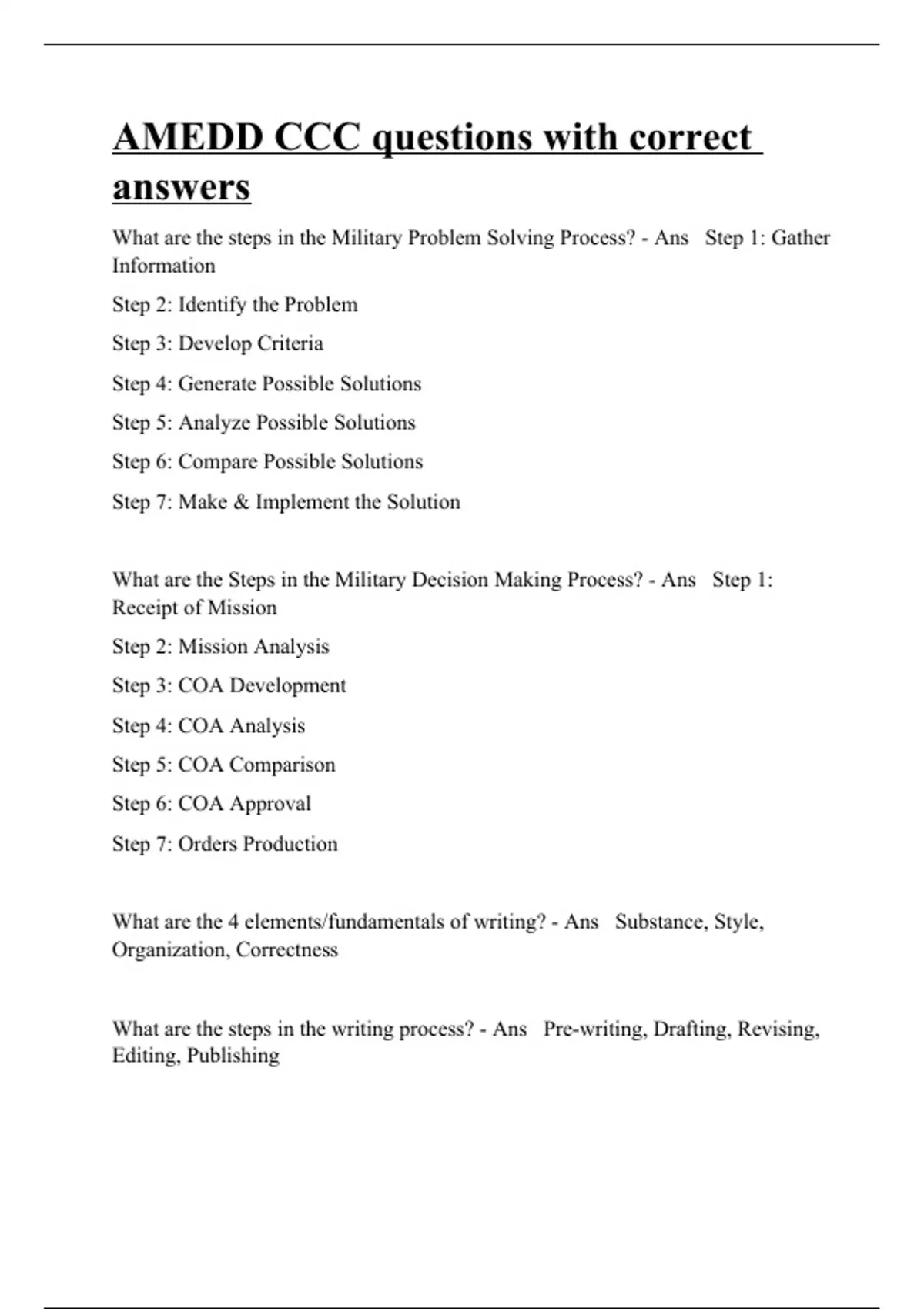 What are the steps in the Military Problem Solving Process? - Ans Step 1: Gather Information Step 2: Identify the Problem Step 3: Develop Criteria Step 4: Generate Possible Solutions Step 5: Analyze Possible Solutions Step 6: Compare Possible Solutions Step 7: Make & Implement the Solution What are the Steps in the Military Decision Making Process? - Ans Step 1: Receipt of Mission Step 2: Mission Analysis Step 3: COA Development Step 4: COA Analysis Step 5: COA Comparison Step 6: COA Approval Step 7: Orders Production What are the 4 elements/fundamentals of writing? - Ans Substance, Style, Organization, Correctness What are the steps in the writing process? - Ans Pre-writing, Drafting, Revising, Editing, Publishing