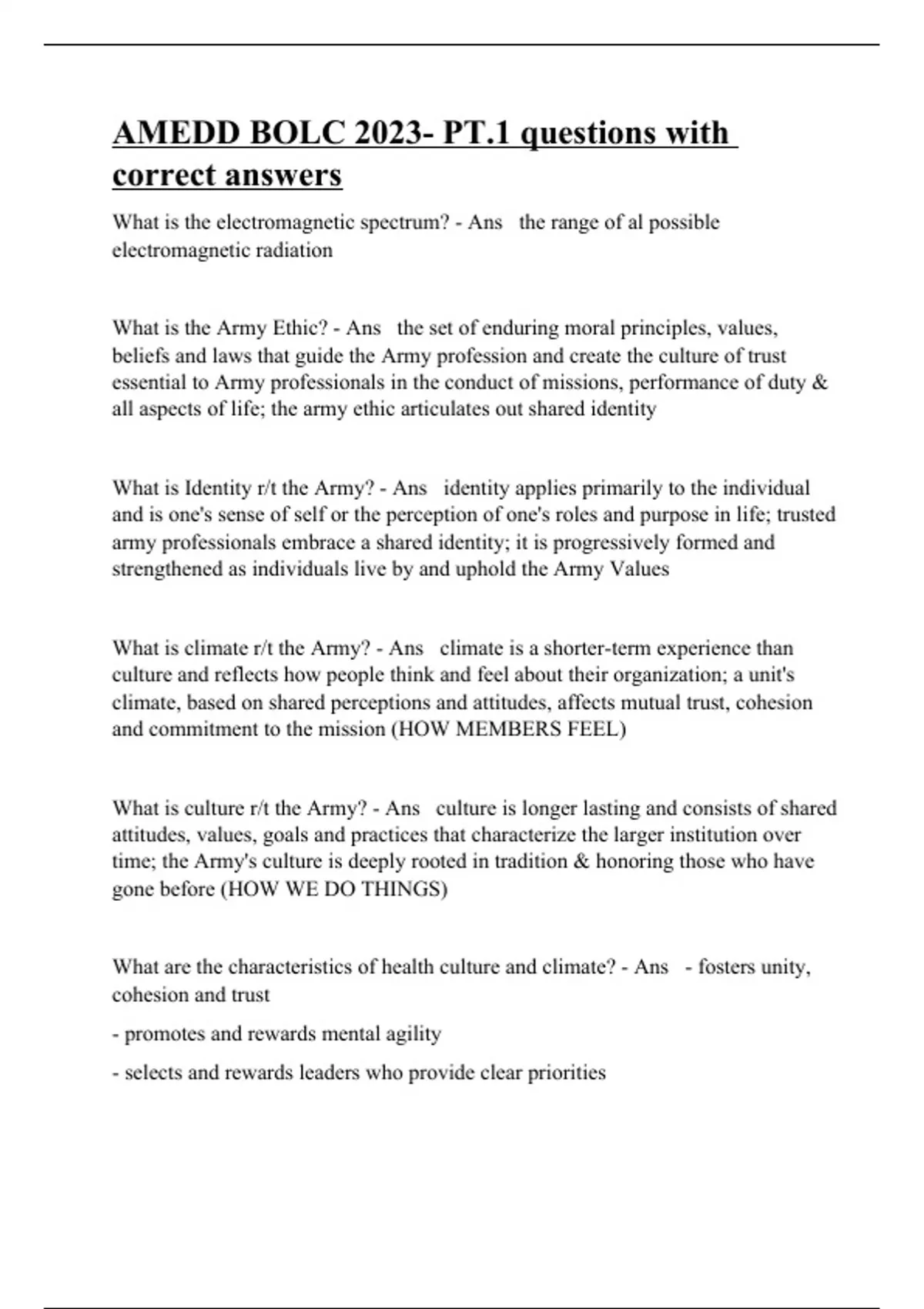 What is the electromagnetic spectrum? - Ans the range of al possible electromagnetic radiation What is the Army Ethic? - Ans the set of enduring moral principles, values, beliefs and laws that guide the Army profession and create the culture of trust essential to Army professionals in the conduct of missions, performance of duty & all aspects of life; the army ethic articulates out shared identity What is Identity r/t the Army? - Ans identity applies primarily to the individual and is one's sense of self or the perception of one's roles and purpose in life; trusted army professionals embrace a shared identity; it is progressively formed and strengthened as individuals live by and uphold the Army Values What is climate r/t the Army? - Ans climate is a shorter-term experience than culture and reflects how people think and feel about their organization; a unit's climate, based on shared perceptions and attitudes, affects mutual trust, cohesion and commitment to the mission (HOW MEMBERS FEEL) What is culture r/t the Army? - Ans culture is longer lasting and consists of shared attitudes, values, goals and practices that characterize the larger institution over time; the Army's culture is deeply rooted in tradition & honoring those who have gone before (HOW WE DO THINGS) What are the characteristics of health culture and climate? - Ans - fosters unity,