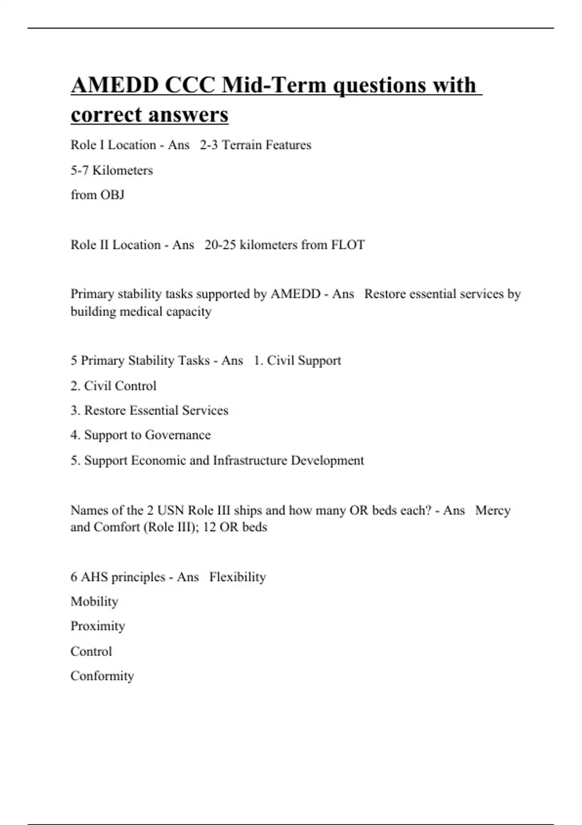 Role I Location - Ans 2-3 Terrain Features 5-7 Kilometers from OBJ Role II Location - Ans 20-25 kilometers from FLOT Primary stability tasks supported by AMEDD - Ans Restore essential services by building medical capacity 5 Primary Stability Tasks - Ans 1. Civil Support 2. Civil Control 3. Restore Essential Services 4. Support to Governance 5. Support Economic and Infrastructure Development Names of the 2 USN Role III ships and how many OR beds each? - Ans Mercy and Comfort (Role III); 12 OR beds 6 AHS principles - Ans Flexibility Mobility Proximity Control