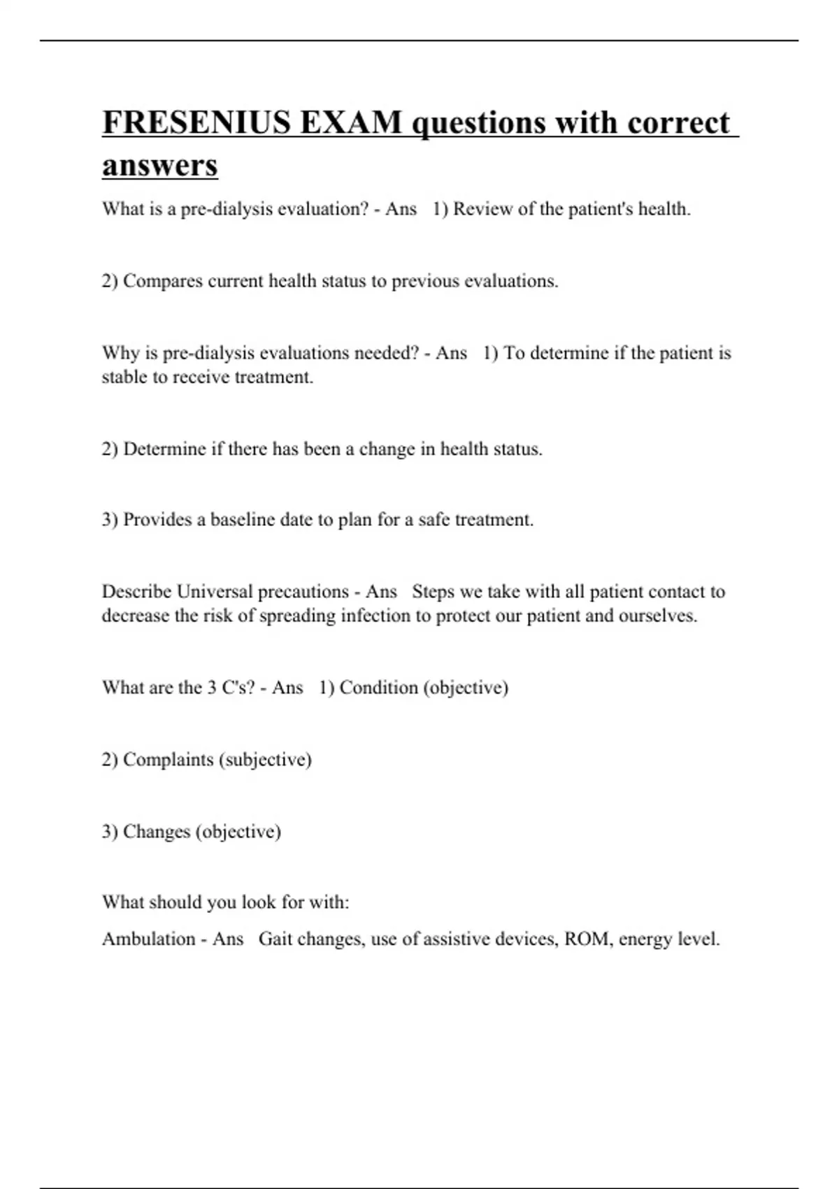 What is a pre-dialysis evaluation? - Ans 1) Review of the patient's health. 2) Compares current health status to previous evaluations. Why is pre-dialysis evaluations needed? - Ans 1) To determine if the patient is stable to receive treatment. 2) Determine if there has been a change in health status. 3) Provides a baseline date to plan for a safe treatment. Describe Universal precautions - Ans Steps we take with all patient contact to decrease the risk of spreading infection to protect our patient and ourselves. What are the 3 C's? - Ans 1) Condition (objective) 2) Complaints (subjective) 3) Changes (objective) What should you look for with: Ambulation - Ans Gait changes, use of assistive devices, ROM, energy level.