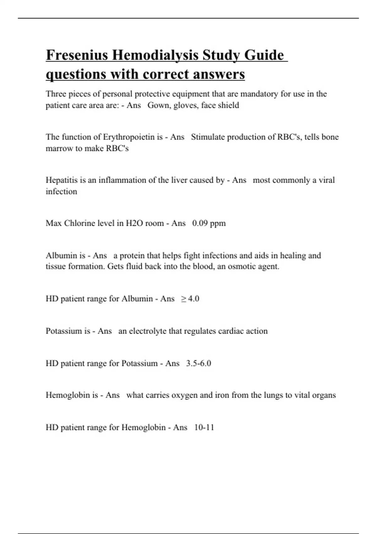 Three pieces of personal protective equipment that are mandatory for use in the patient care area are: - Ans Gown, gloves, face shield The function of Erythropoietin is - Ans Stimulate production of RBC's, tells bone marrow to make RBC's Hepatitis is an inflammation of the liver caused by - Ans most commonly a viral infection Max Chlorine level in H2O room - Ans 0.09 ppm Albumin is - Ans a protein that helps fight infections and aids in healing and tissue formation. Gets fluid back into the blood, an osmotic agent. HD patient range for Albumin - Ans ≥ 4.0 Potassium is - Ans an electrolyte that regulates cardiac action HD patient range for Potassium - Ans 3.5-6.0 Hemoglobin is - Ans what carries oxygen and iron from the lungs to vital organs HD patient range for Hemoglobin - Ans 10-11