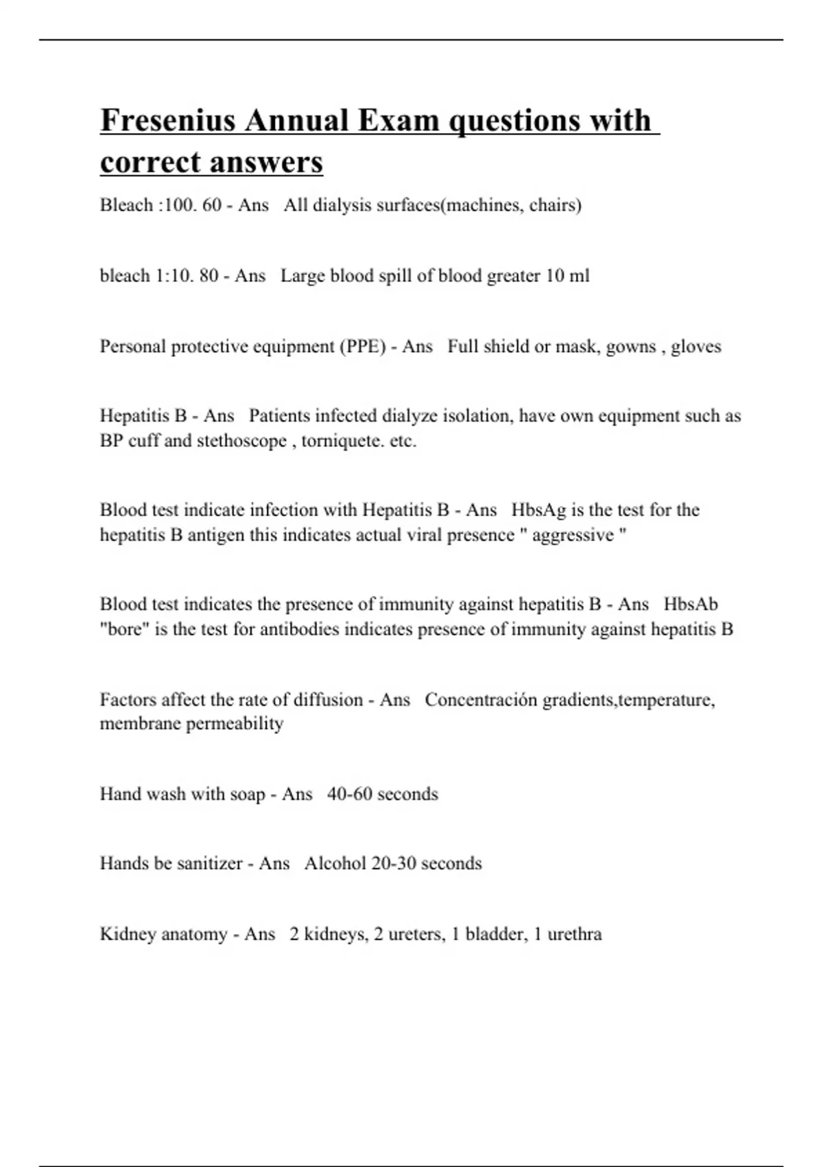 Bleach :100. 60 - Ans All dialysis surfaces(machines, chairs) bleach 1:10. 80 - Ans Large blood spill of blood greater 10 ml Personal protective equipment (PPE) - Ans Full shield or mask, gowns , gloves Hepatitis B - Ans Patients infected dialyze isolation, have own equipment such as BP cuff and stethoscope , torniquete. etc. Blood test indicate infection with Hepatitis B - Ans HbsAg is the test for the hepatitis B antigen this indicates actual viral presence " aggressive " Blood test indicates the presence of immunity against hepatitis B - Ans HbsAb "bore" is the test for antibodies indicates presence of immunity against hepatitis B Factors affect the rate of diffusion - Ans Concentración gradients,temperature, membrane permeability Hand wash with soap - Ans 40-60 seconds Hands be sanitizer - Ans Alcohol 20-30 seconds Kidney anatomy - Ans 2 kidneys, 2 ureters, 1 bladder, 1 urethra
