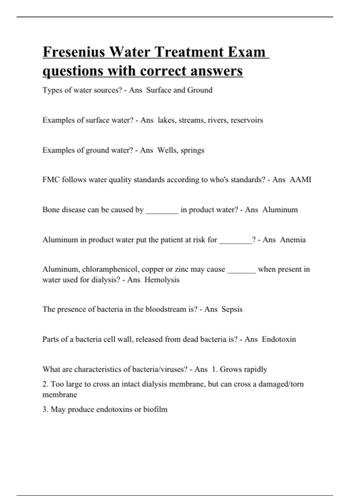 Types of water sources? - Ans Surface and Ground Examples of surface water? - Ans lakes, streams, rivers, reservoirs Examples of ground water? - Ans Wells, springs FMC follows water quality standards according to who's standards? - Ans AAMI Bone disease can be caused by ________ in product water? - Ans Aluminum Aluminum in product water put the patient at risk for ________? - Ans Anemia Aluminum, chloramphenicol, copper or zinc may cause _______ when present in water used for dialysis? - Ans Hemolysis The presence of bacteria in the bloodstream is? - Ans Sepsis Parts of a bacteria cell wall, released from dead bacteria is? - Ans Endotoxin What are characteristics of bacteria/viruses? - Ans 1. Grows rapidly 2. Too large to cross an intact dialysis membrane, but can cross a damaged/torn membrane 3. May produce endotoxins or biofilm