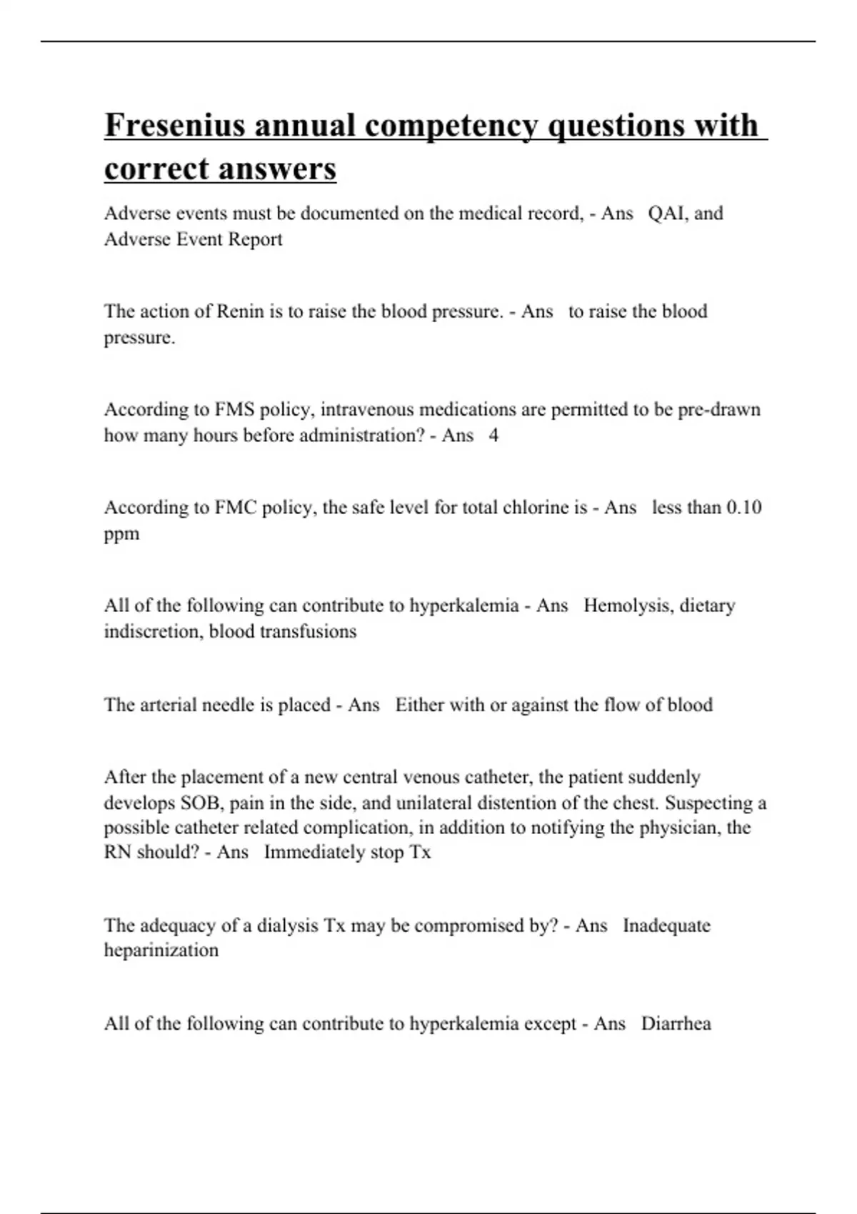 Adverse events must be documented on the medical record, - Ans QAI, and Adverse Event Report The action of Renin is to raise the blood pressure. - Ans to raise the blood pressure. According to FMS policy, intravenous medications are permitted to be pre-drawn how many hours before administration? - Ans 4 According to FMC policy, the safe level for total chlorine is - Ans less than 0.10 ppm All of the following can contribute to hyperkalemia - Ans Hemolysis, dietary indiscretion, blood transfusions The arterial needle is placed - Ans Either with or against the flow of blood After the placement of a new central venous catheter, the patient suddenly develops SOB, pain in the side, and unilateral distention of the chest. Suspecting a possible catheter related complication, in addition to notifying the physician, the RN should? - Ans Immediately stop Tx The adequacy of a dialysis Tx may be compromised by? - Ans Inadequate