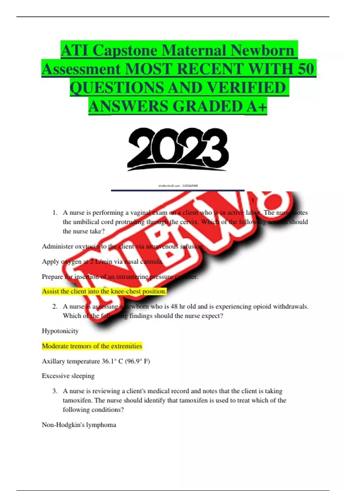 ATI Capstone Maternal Newborn Assessment MOST RECENT WITH 50 QUESTIONS AND VERIFIED ANSWERS GRADED A+1. A nurse is performing a vaginal exam on a client who is in active labor. The nurse notes the umbilical cord protruding through the cervix. Which of the following actions should the nurse take? Administer oxytocin to the client via intravenous infusion. Apply oxygen at 2 L/min via nasal cannula. Prepare for insertion of an intrauterine pressure catheter. Assist the client into the knee-chest position. 2. A nurse is assessing a newborn who is 48 hr old and is experiencing opioid withdrawals. Which of the following findings should the nurse expect? Hypotonicity Moderate tremors of the extremities Axillary temperature 36.1° C (96.9° F) Excessive sleeping