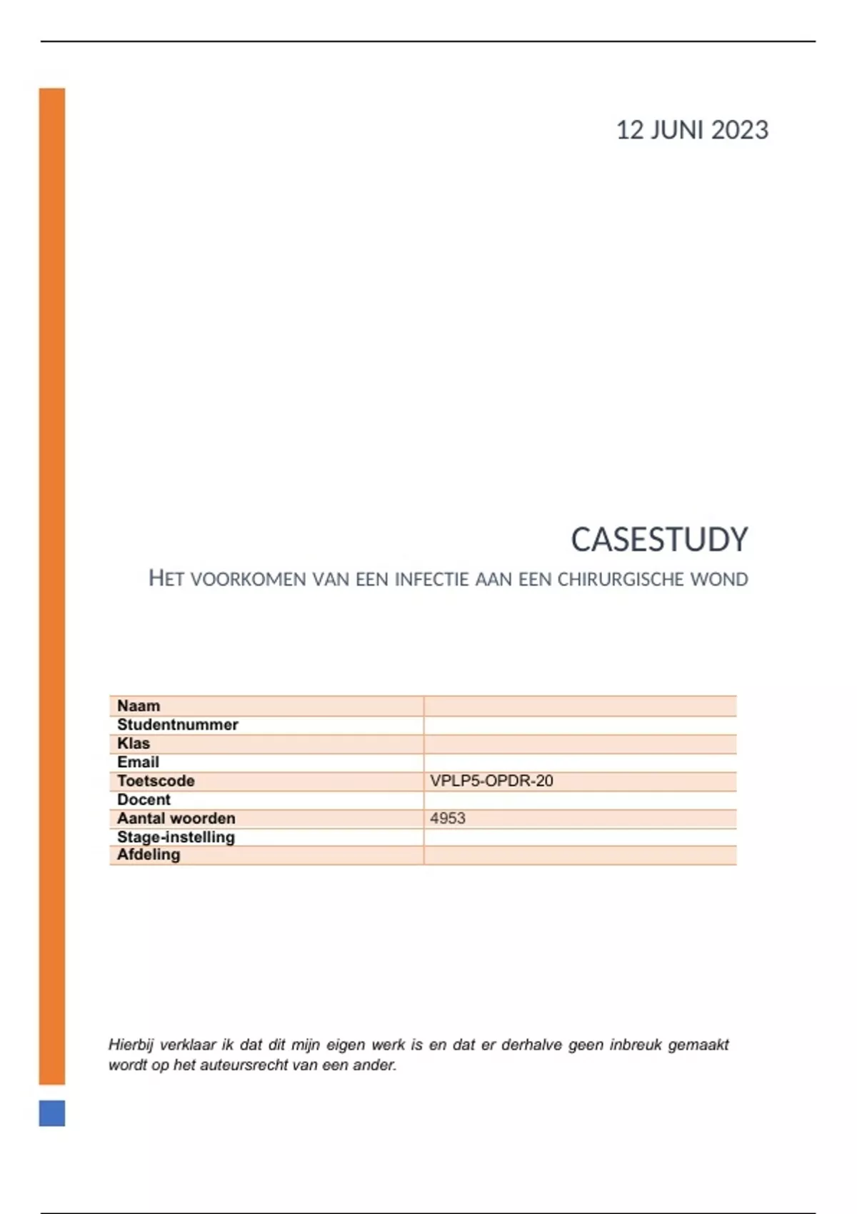 Deze caestudy betreft het onderwerp: het voorkomen van infecties aan chirurgische wonden, waarin ik heb ingezoomd op een casus waarbij er een infectie is opgetreden aan een chirurgische wond. Het doel van dit stuk is het verbeteren van de kwaliteit van zorg en dit onderdeel in de toekomst te kunnen voorkomen dan wel hier beter op te anticiperen. Dit stuk is geschreven tijdens mijn stage van PLP5 in het ziekenhuis op de afdeling chirurgie, en hier behaalde ik een 8,7 voor!