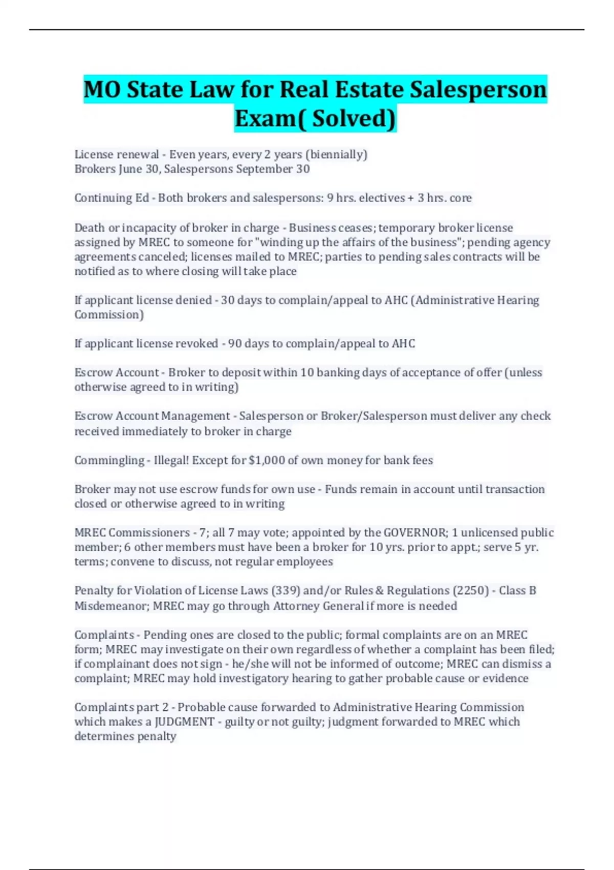 MO State Law for Real Estate Salesperson Exam( Solved)