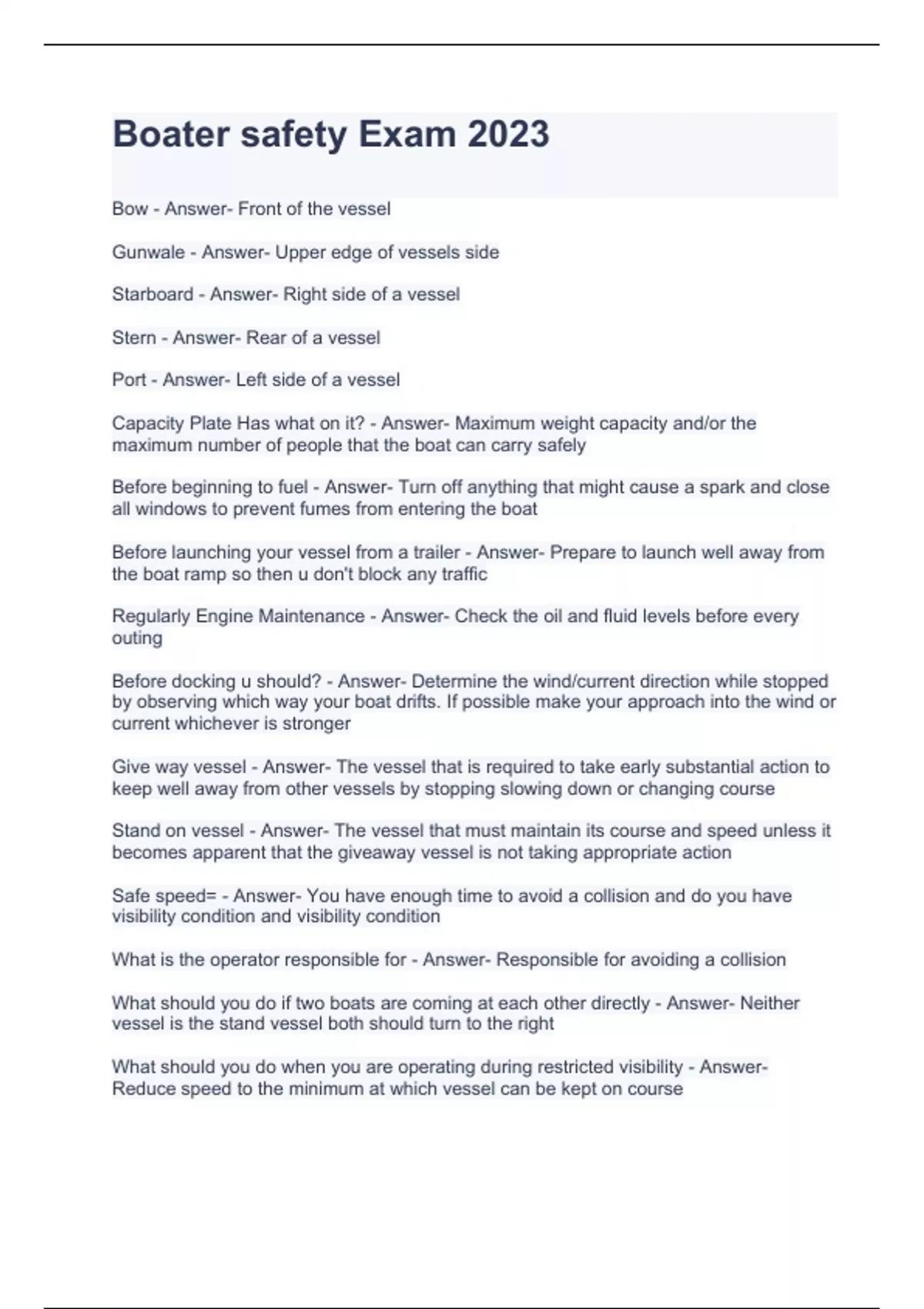 Bow - Answer- Front of the vessel Gunwale - Answer- Upper edge of vessels side Starboard - Answer- Right side of a vessel Stern - Answer- Rear of a vessel Port - Answer- Left side of a vessel Capacity Plate Has what on it? - Answer- Maximum weight capacity and/or the maximum number of people that the boat can carry safely Before beginning to fuel - Answer- Turn off anything that might cause a spark and close all windows to prevent fumes from entering the boat Before launching your vessel from a trailer - Answer- Prepare to launch well away from the boat ramp so then u don't block any traffic Regularly Engine Maintenance - Answer- Check the oil and fluid levels before every outing Before docking u should? - Answer- Determine the wind/current direction while stopped by observing which way your boat drifts. If possible make your approach into the wind or current whichever is stronger Give way vessel - Answer- The vessel that is required to take early substantial action to keep well away from other vessels by stopping slowing down or changing course Stand on vessel - Answer- The vessel that must maintain its course and speed unless it becomes apparent that the giveaway vessel is not taking appropriate action Safe speed= - Answer- You have enough time to avoid a collision and do you have visibility condition and visibility condition What is the operator responsible for - Answer- Responsible for avoiding a collision