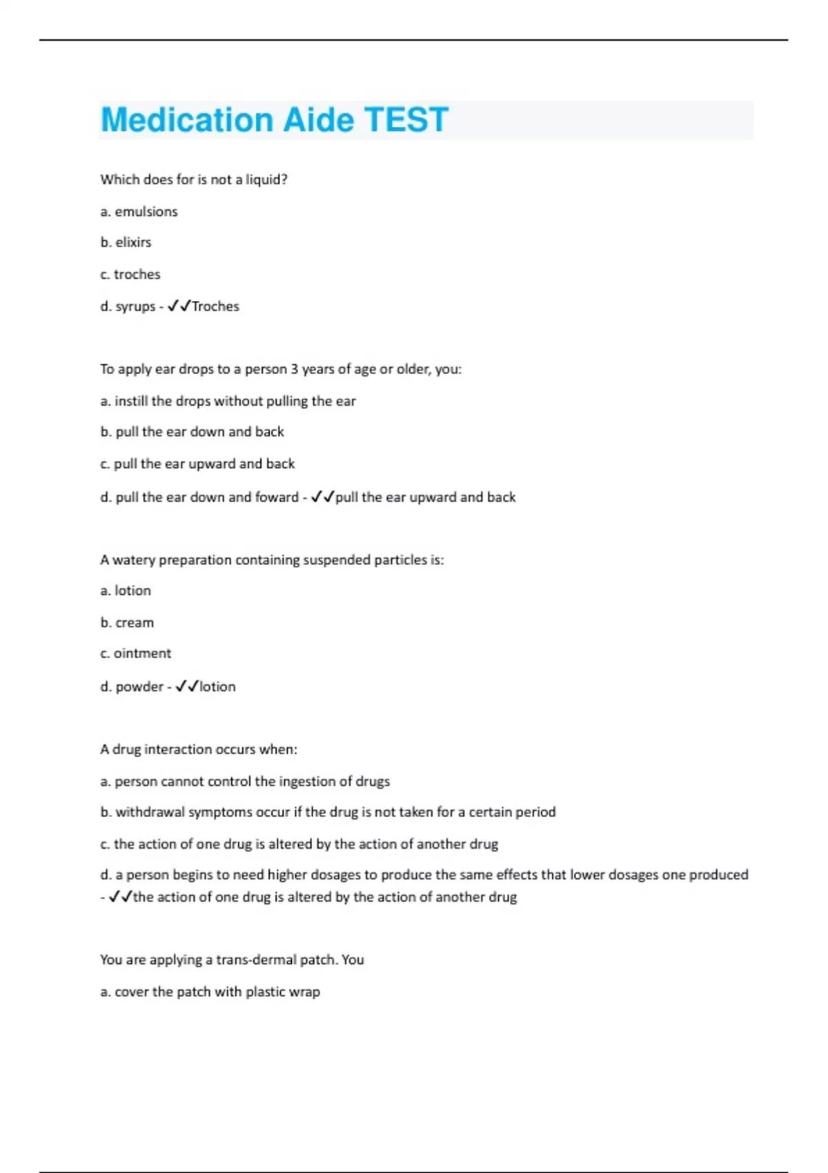 Which does for is not a liquid? a. emulsions b. elixirs c. troches d. syrups - Troches To apply ear drops to a person 3 years of age or older, you: a. instill the drops without pulling the ear b. pull the ear down and back c. pull the ear upward and back d. pull the ear down and foward - pull the ear upward and back A watery preparation containing suspended particles is: a. lotion b. cream c. ointment d. powder - lotion A drug interaction occurs when: a. person cannot control the ingestion of drugs b. withdrawal symptoms occur if the drug is not taken for a certain period c. the action of one drug is altered by the action of another drug d. a person begins to need higher dosages to produce the same effects that lower dosages one produced - the action of one drug is altered by the action of another drug You are applying a trans-dermal patch. You a. cover the patch with plastic wrapb. remove the old trans-dermal path before applying the new patch c. discard it in the trash d. tell the person the drug is absorbed quickly - remove the old trans-dermal path before applying the new patch Before giving a drug, you must a. take the persons pulse b. measure the blood pressure c. check the care plan d. check the allergies - check the allergies Knowledge of what is right conduct and what is wrong conduct is a. criminal law b. civil law c. advanced directives d. ethics - ethics one tsp equals a. 5mL b. 30mL c. 2mL d. 10mL - 5mL You are applying topical nitroglycerin. You a. rub or massage the ointment into the skin b. check for an old application before applying a new one c. apply it in the per area d. apply the ointment to an irritated or open area - check for an old application before applying a new one