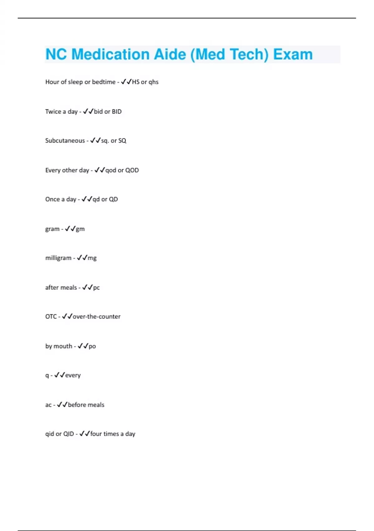 Hour of sleep or bedtime - HS or qhs Twice a day - bid or BID Subcutaneous - sq. or SQ Every other day - qod or QOD Once a day - qd or QD gram - gm milligram - mg after meals - pc OTC - over-the-counter by mouth - po q - every ac - before meals qid or QID - four times a daytsp - teaspoonful prn or PRN - as needed Tbsp - Tablespoonful tid or TID - Three times a day ml - milliliter oz - ounce MAR - Medication administration record The following are abbreviations for drug routes, EXCEPT - PD You receive an order for Nitroglycerin to be given sublingually. It would be given - Under the tongue The following are abbreviations for dosages or strengths of medications EXCEPT - PD