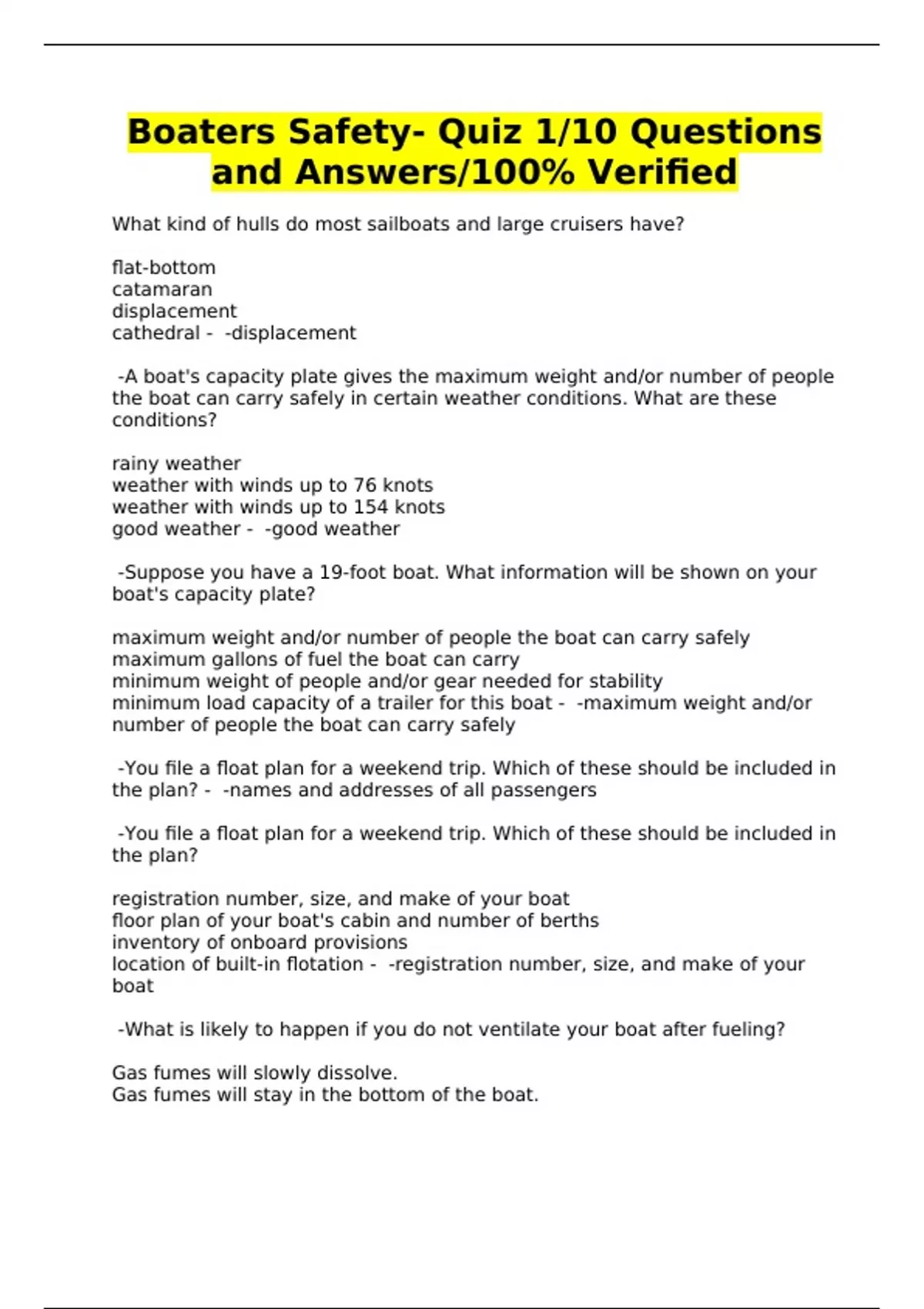 Boaters Safety- Quiz 1/10 Questions and Answers/100% Verified