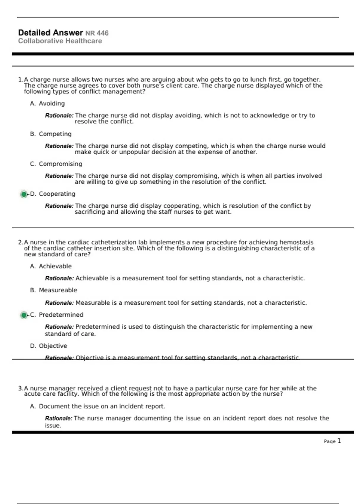 1. A charge nurse allows two nurses who are arguing about who gets to go to lunch first, go together. The charge nurse agrees to cover both nurse’s client care. The charge nurse displayed which of the following types of conflict management? A. Avoiding Rationale: The charge nurse did not display avoiding, which is not to acknowledge or try to resolve the conflict. B. Competing Rationale: The charge nurse did not display competing, which is when the charge nurse would make quick or unpopular decision at the expense of another. C. Compromising Rationale: The charge nurse did not display compromising, which is when all parties involved are willing to give up something in the resolution of the conflict. D. Cooperating Rationale: The charge nurse did display cooperating, which is resolution of the conflict by sacrificing and allowing the staff nurses to get want
