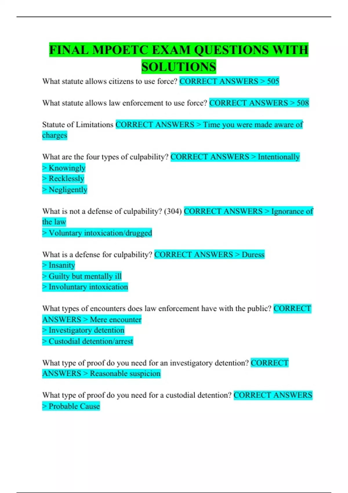 FINAL MPOETC EXAM QUESTIONS WITH SOLUTIONS What statute allows citizens to use force? What statute allows law enforcement to use force? Statute of Limitations What are the four types of culpability? What is not a defense of culpability? (304) What is a defense for culpability? What types of encounters does law enforcement have with the public? What type of proof do you need for an investigatory detention? What type of proof do you need for a custodial detention? What are the three components of the Criminal Justice System? Level of Government Courts (court system) Initial Appearance (preliminary arraignment) Preliminary Hearing Formal Arraignment Common Pleas Court (criminal court) Bail ROR ( released on recognizance) PA is the only state in which the grand jury has what?